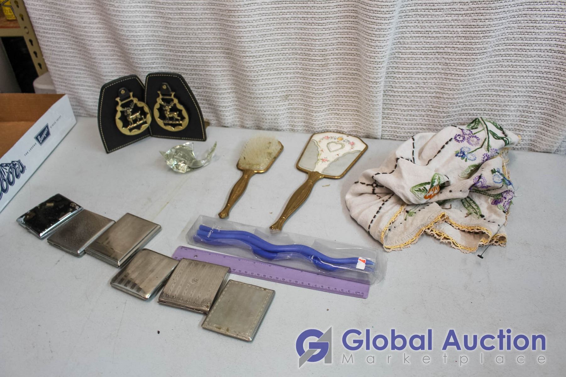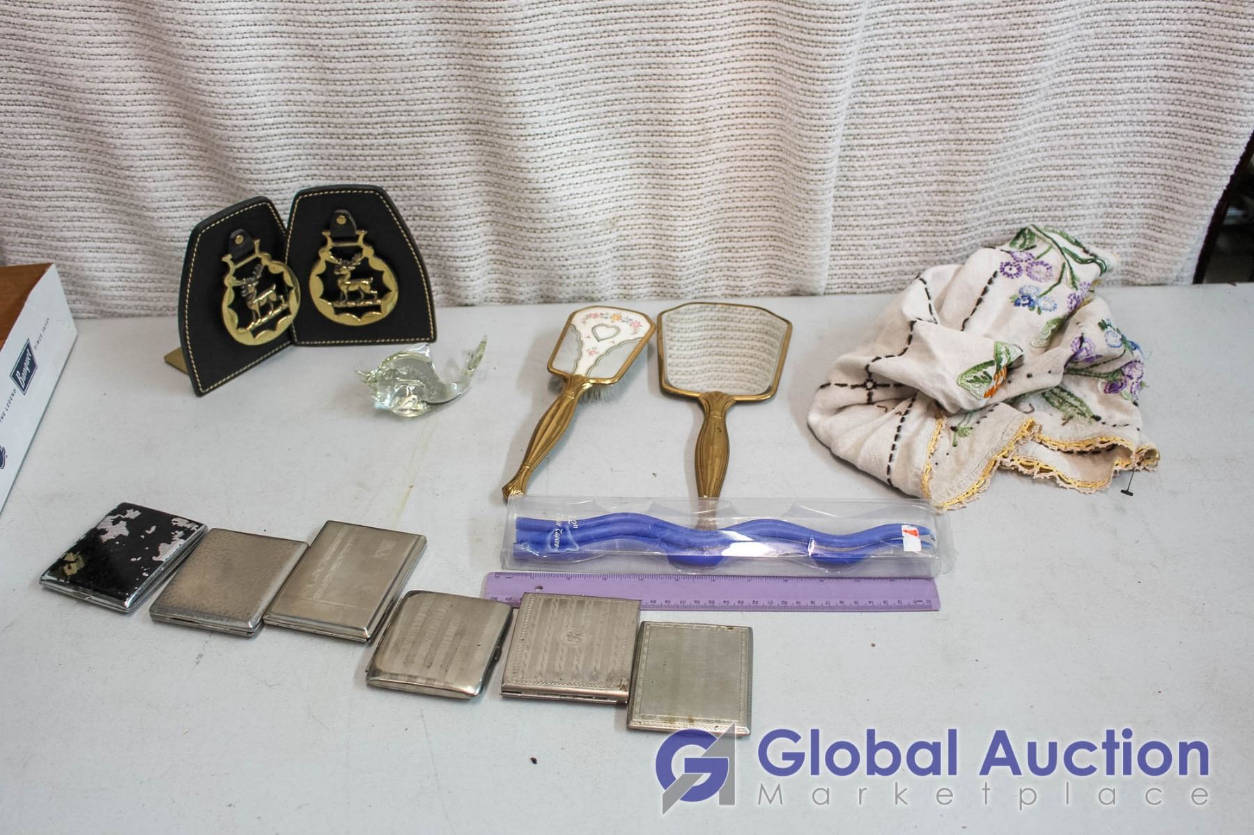 Lot of Misc Items (Book Ends, Cigarette Cases, Vintage Hand Mirror & Hair rush, etc)