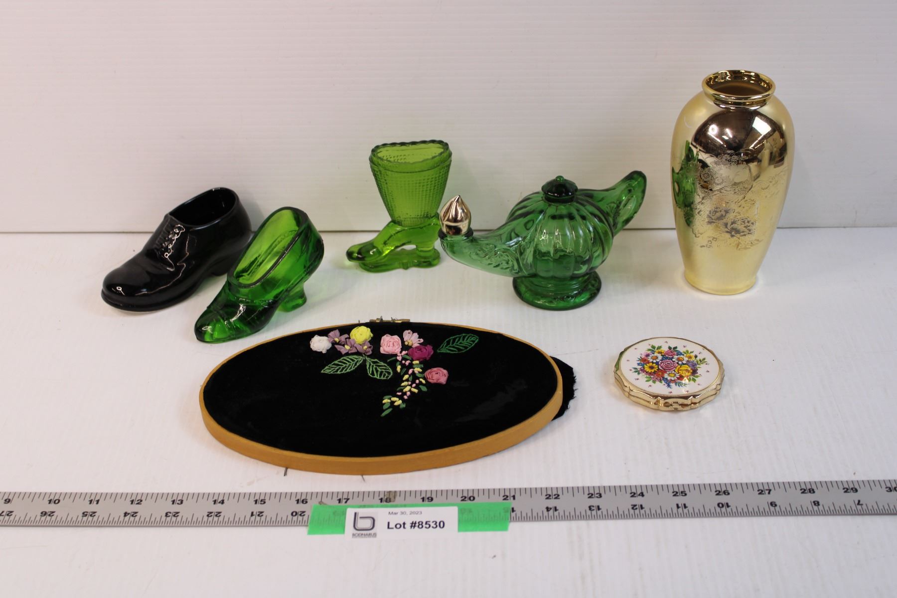 Lot of Misc. Items - Needle Work Art, Boot Vases and Planter