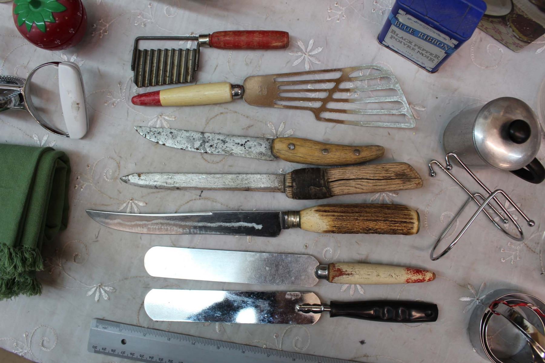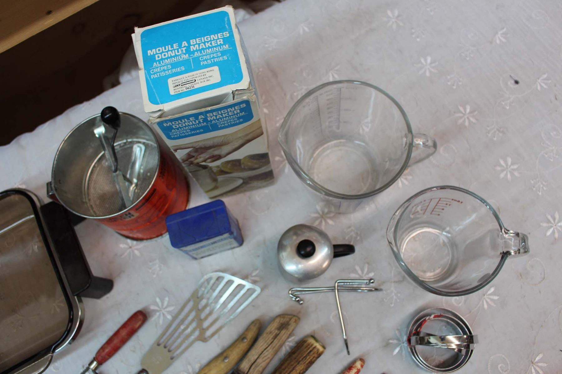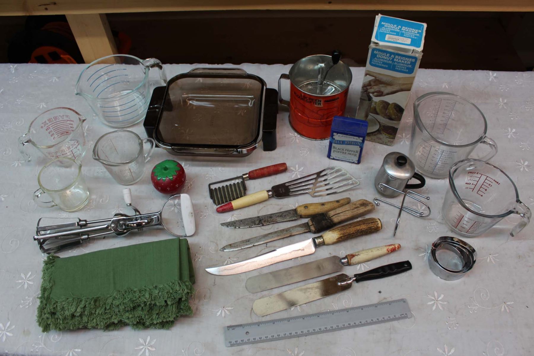 Lot of Misc Kitchenware (Measuring Cups, Knives, Timer, Cloth Napkins, Sifters)