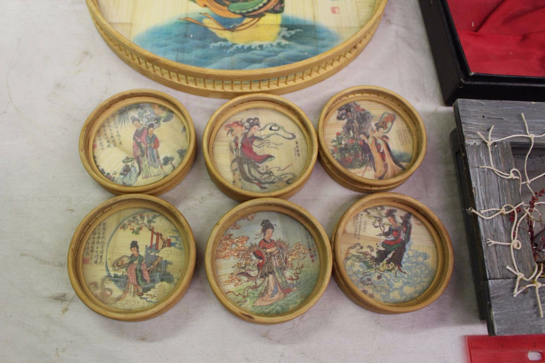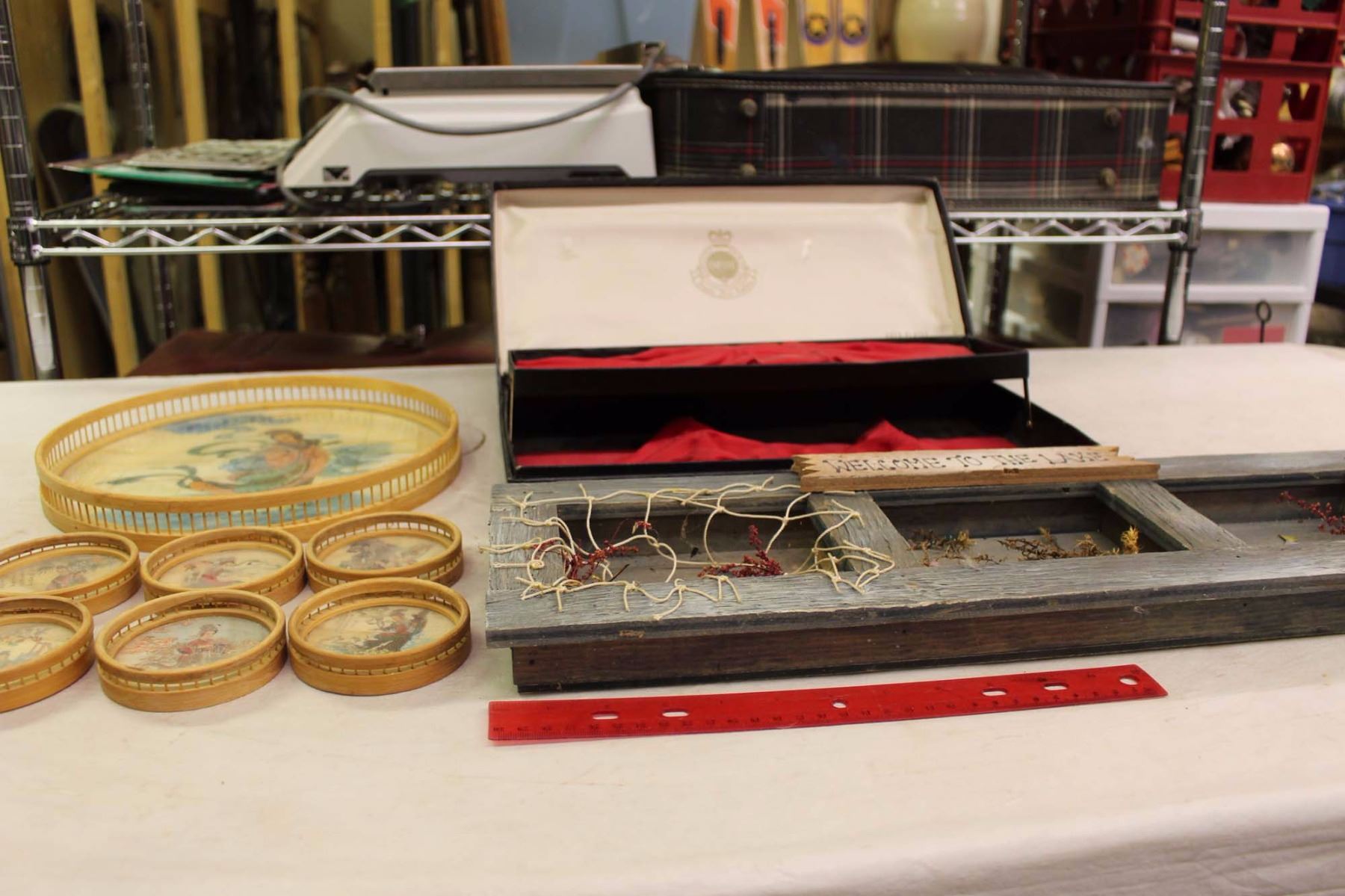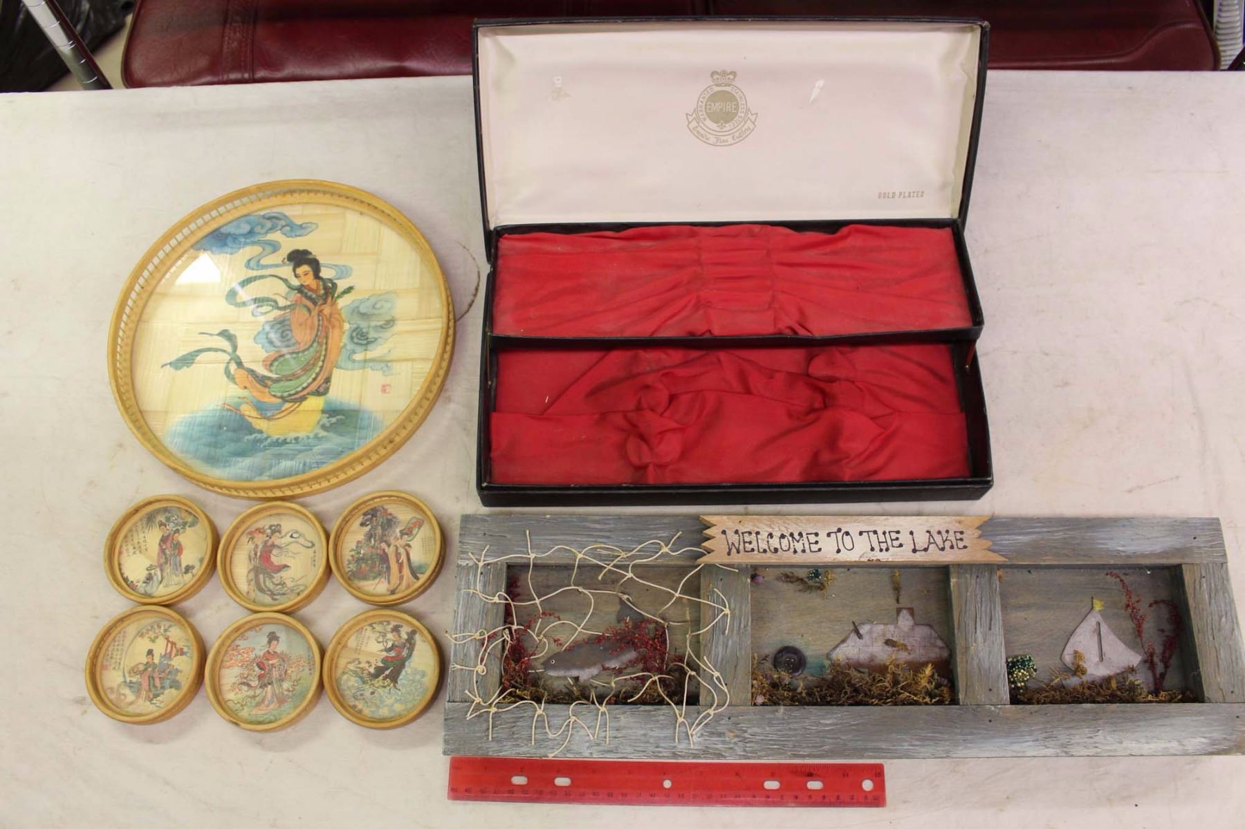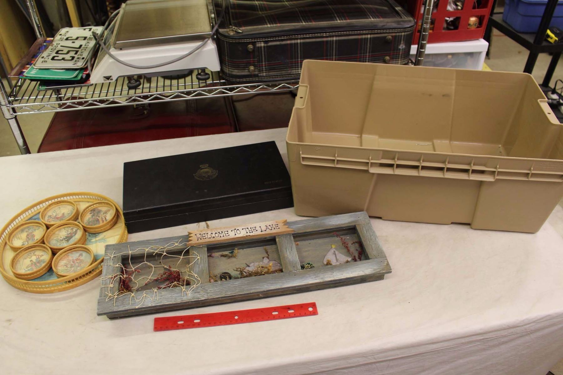 Lot of Misc (Lake Decoration, Cup Coaster Set, Cutlery Box)w/Tote Container