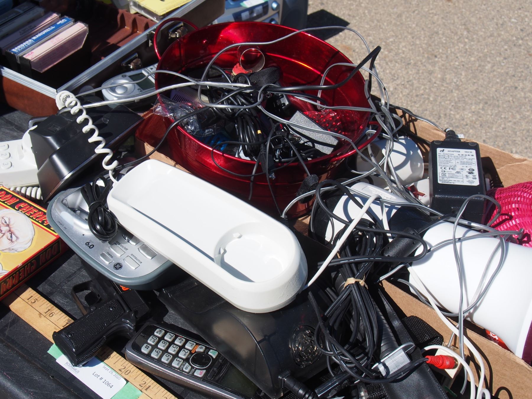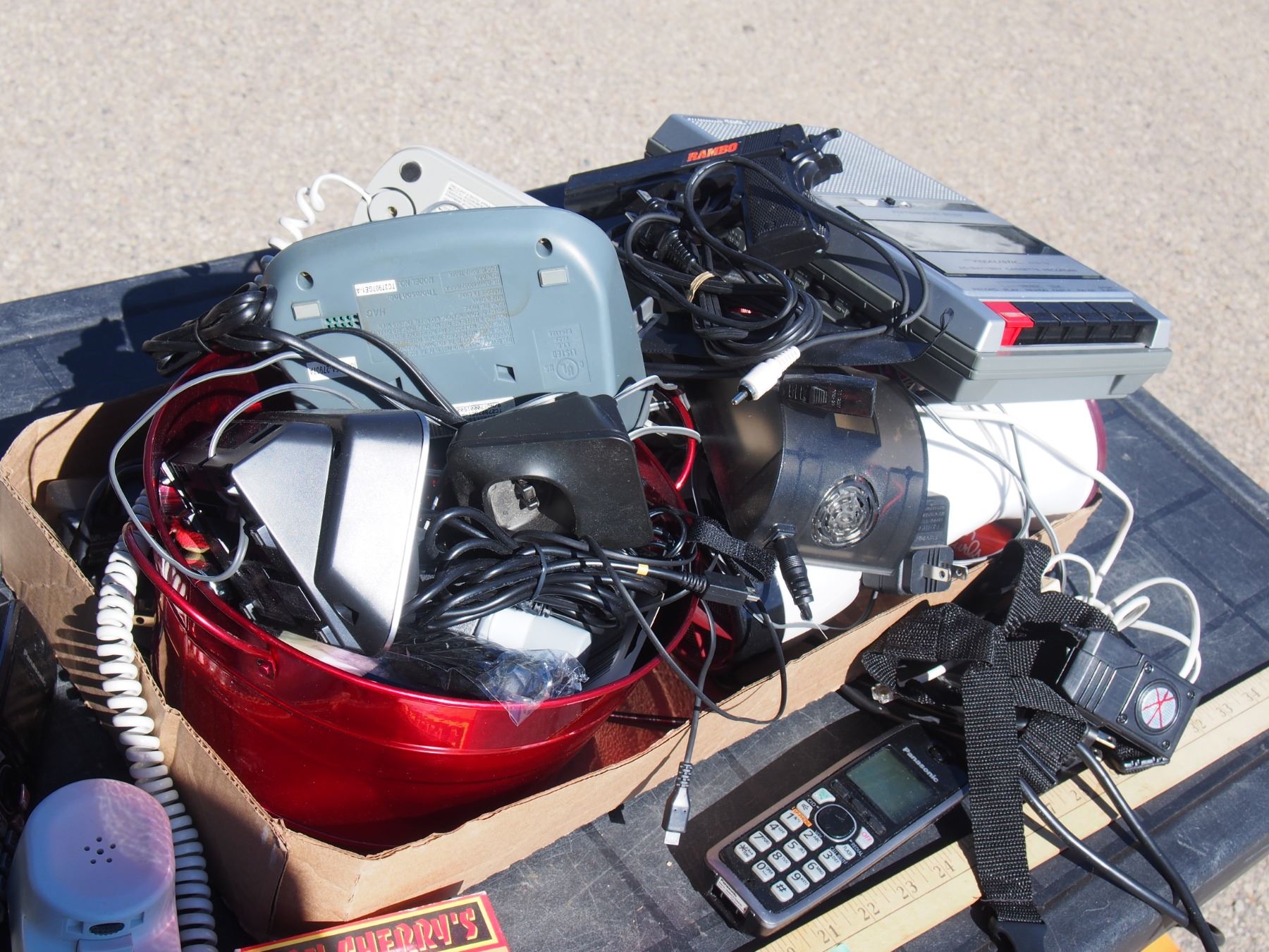 Lot of Misc Phone Batteries, Cordless Phones, Chargers, Cassette Tapes and Con Cherry VHS Tape