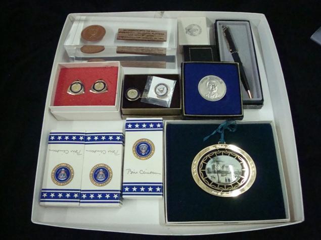 Interesting grouping of misc. presidential memorabilia incl. a piece of oak flooring from the Reagan Inaugural in 1981, a couple of Dan Quayle items incl and autograph, a pair of cuff links from 1973 inaugural ball, etc.
