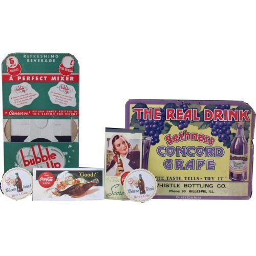 Lot of Misc Soda-Pop Items Coca-Cola Blotter, Coaster & Bridge Pad Concord Grape and a Bubble-Up Cardboard 6-pak Carrier