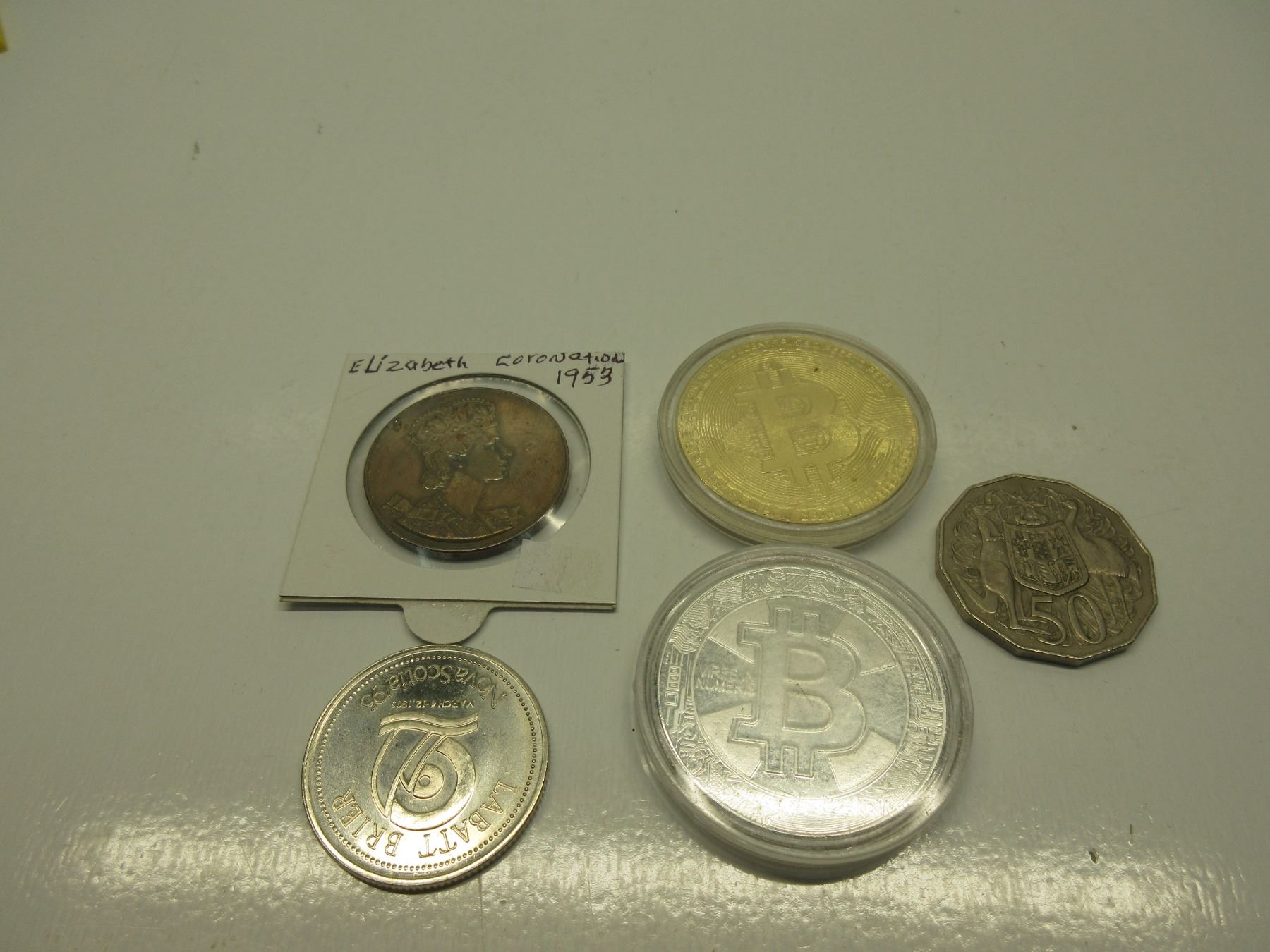 Lot of Misc. Tokens - Labatt Brier Nova Scotia 95, Brass Bitcoin, Silver Bitcoin, Elizabeth Coronation 1953, 50 cents Australia
