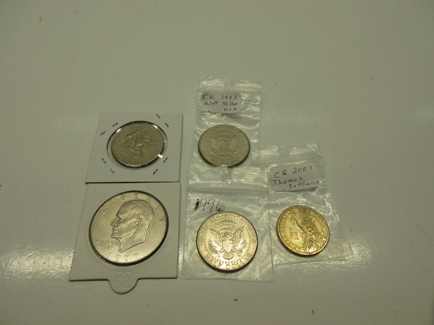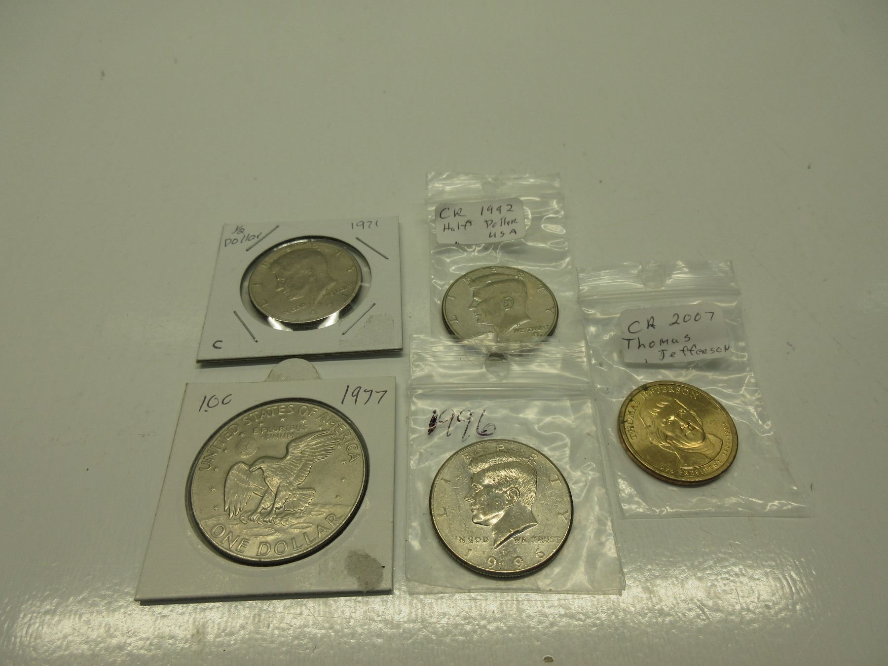 Lot of Misc. USA Coins - 1977 Dollar, 1971 1/2 Dollar, 1996 1/2 Dollar, 1992 1/2 Dollar, 2007 Dollar