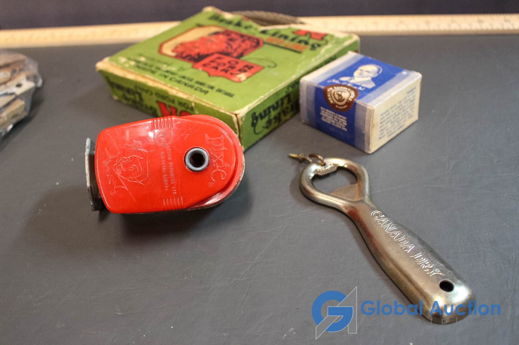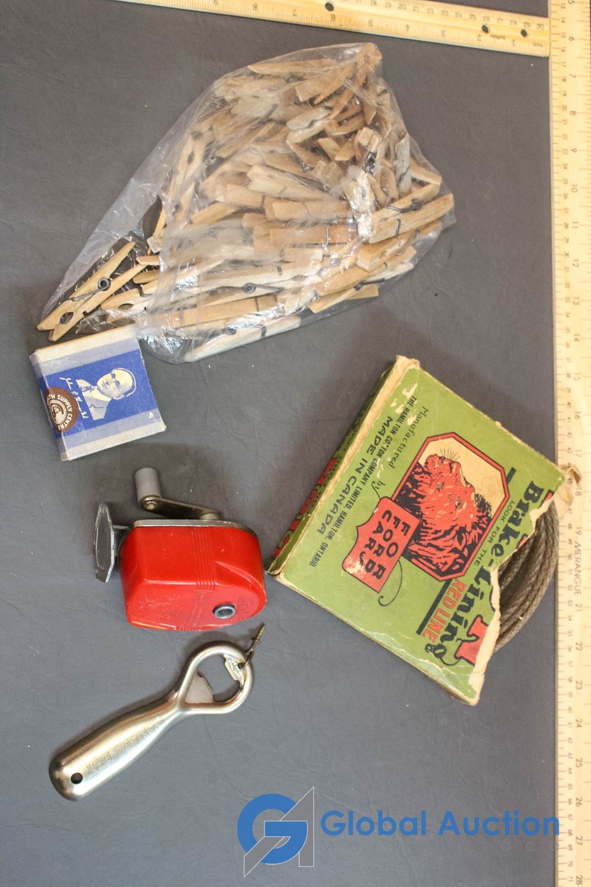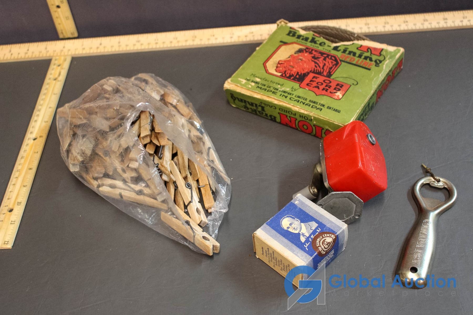 Lot of Misc Vintage Household (Clothes Pins, Pencil Sharpener, Bottle Opener, Brake Lining)