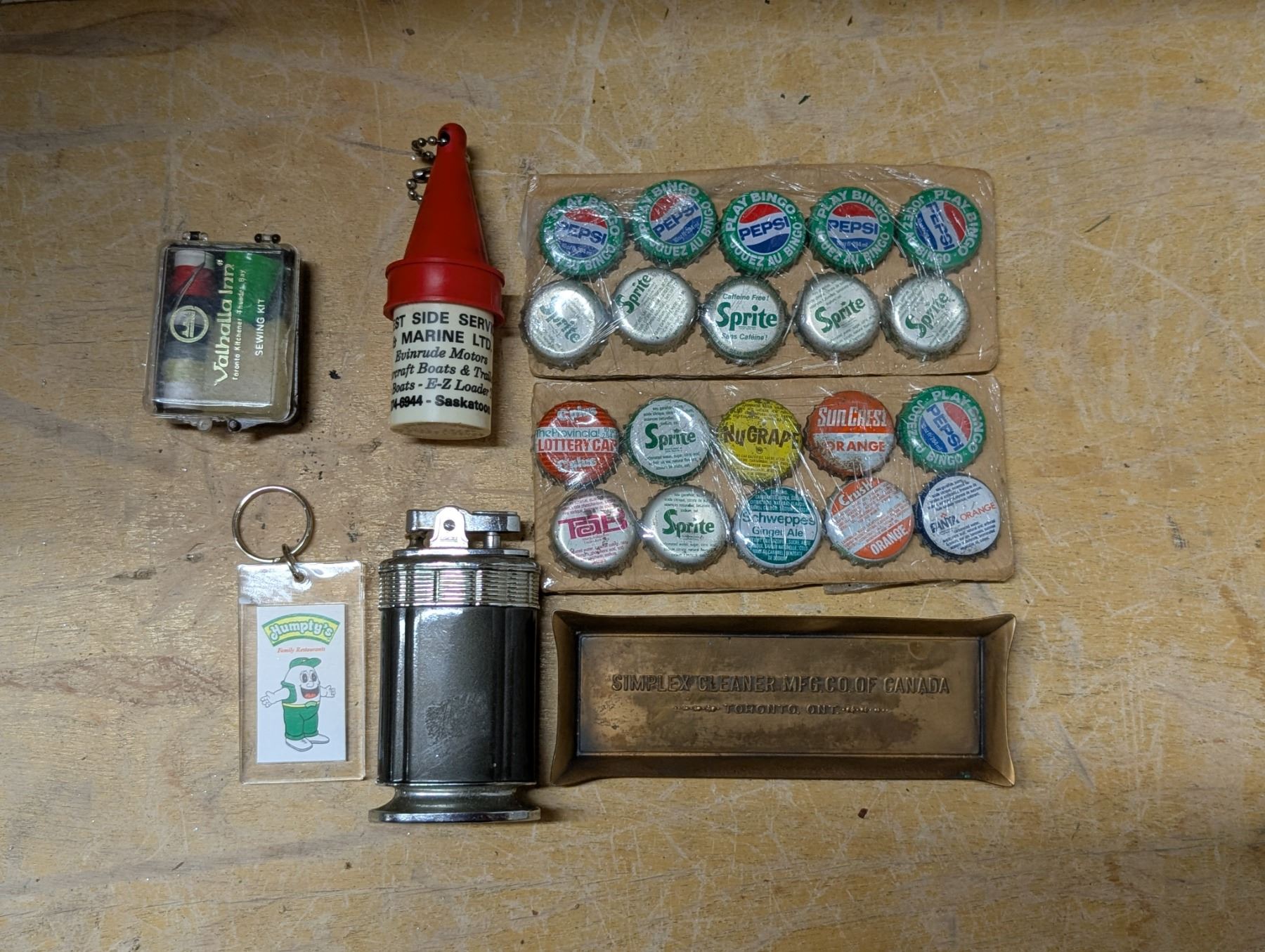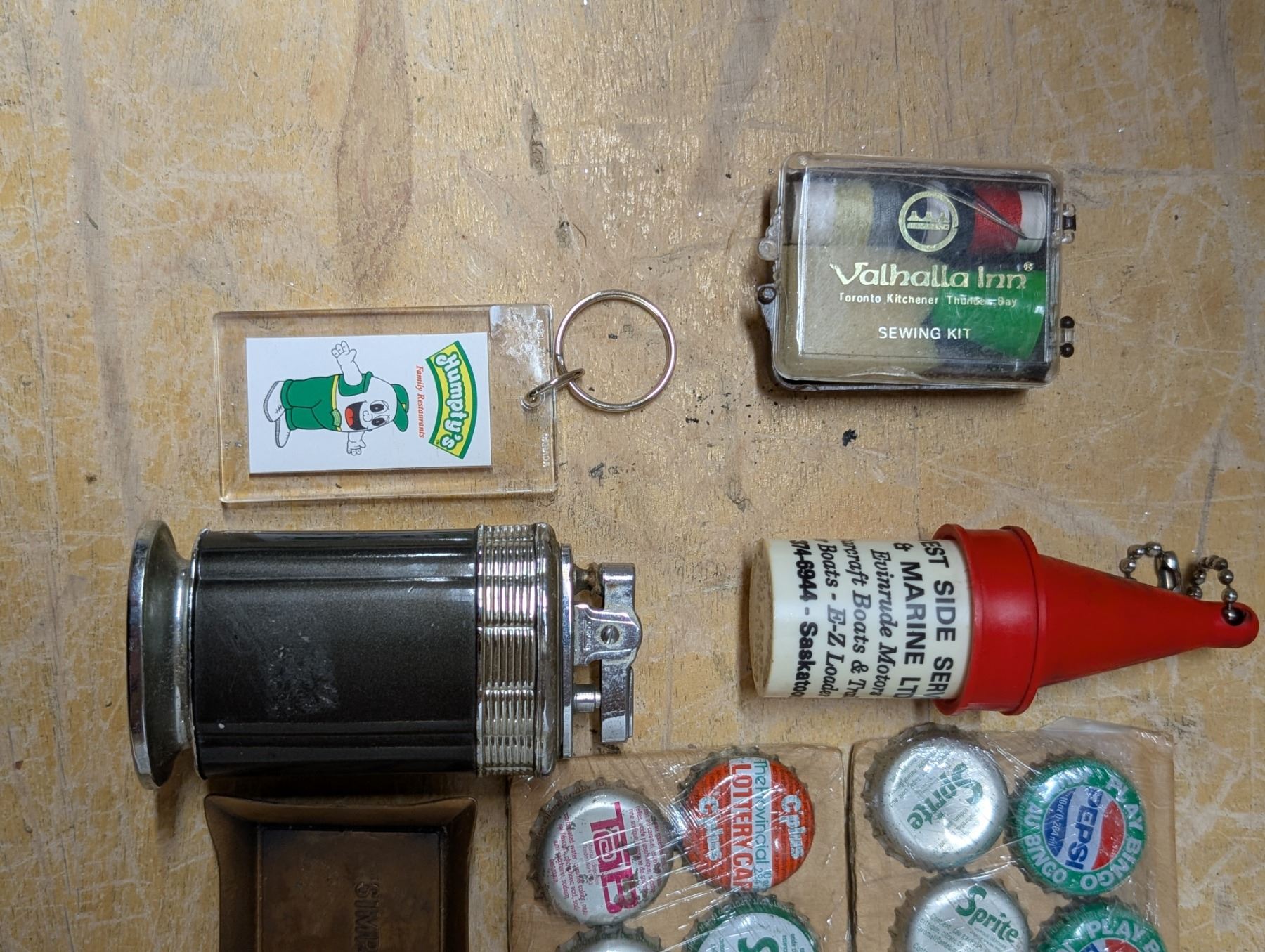 Lot of Misc. Vintage Items (Old pop Lids, Lighter, Humptys keychain, and etc.)