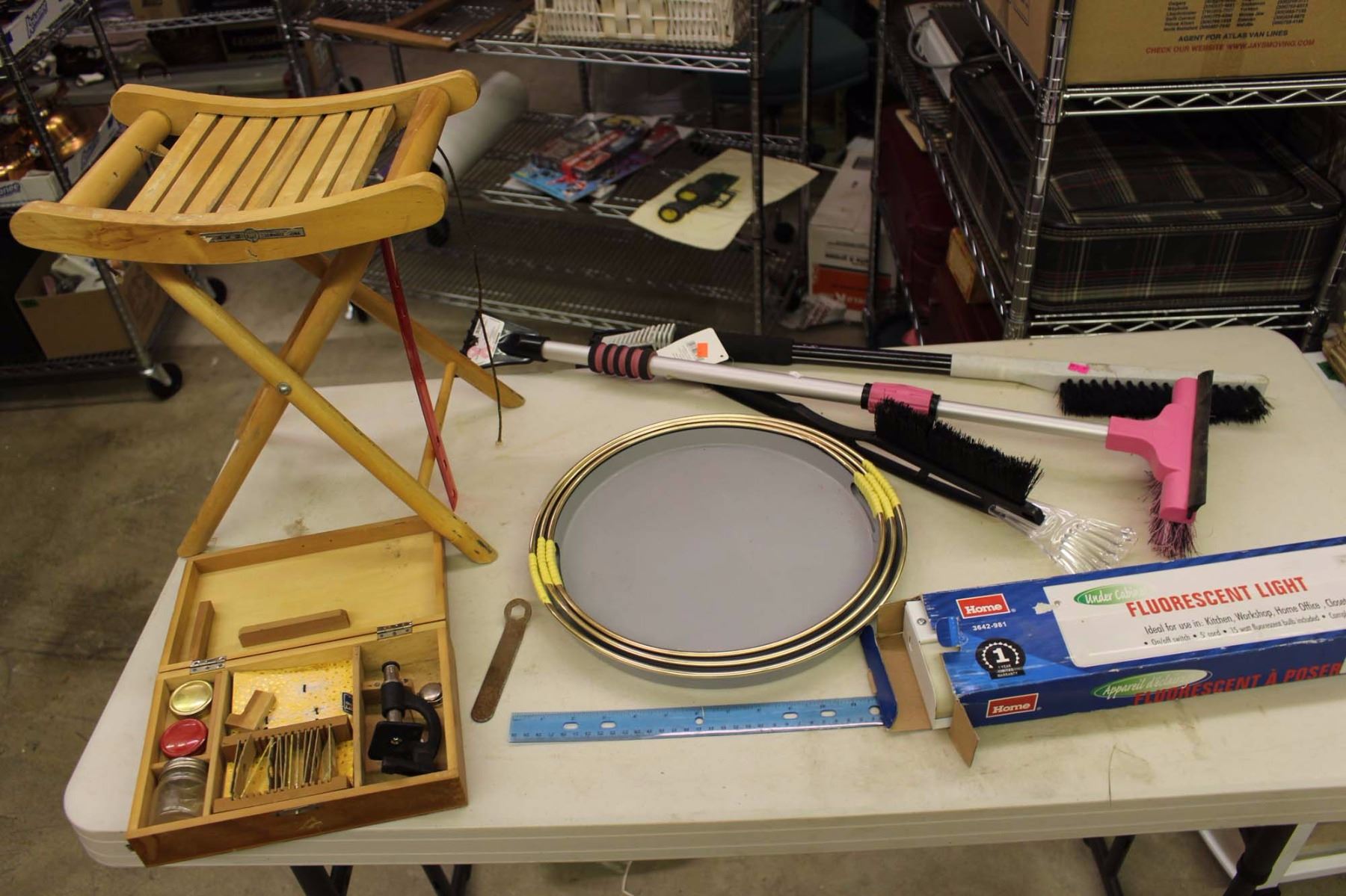 Lot of Misc. (Wooden Folding Stool, Ice Scrapers, Etc)