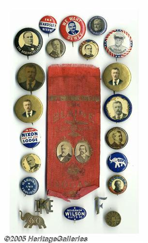 <B>Lot of Miscellaneous Campaign Items 1880s to 1960s</B></I> Here is a lot of 23 pins and one ribbon, all relating to various political campaigns from 1884 until 1960. Included are a 1884 Blaine - Logan ribbon with jugate photos laid down, a Harrison 92 lapel stud, a Harding and Coolidge pinback, and a William H. Taft pinback. Pin sizes range from .75" to 1.25" in diameter, condition is generally fine. Nice collection builder, minimal duplication. Lot:263