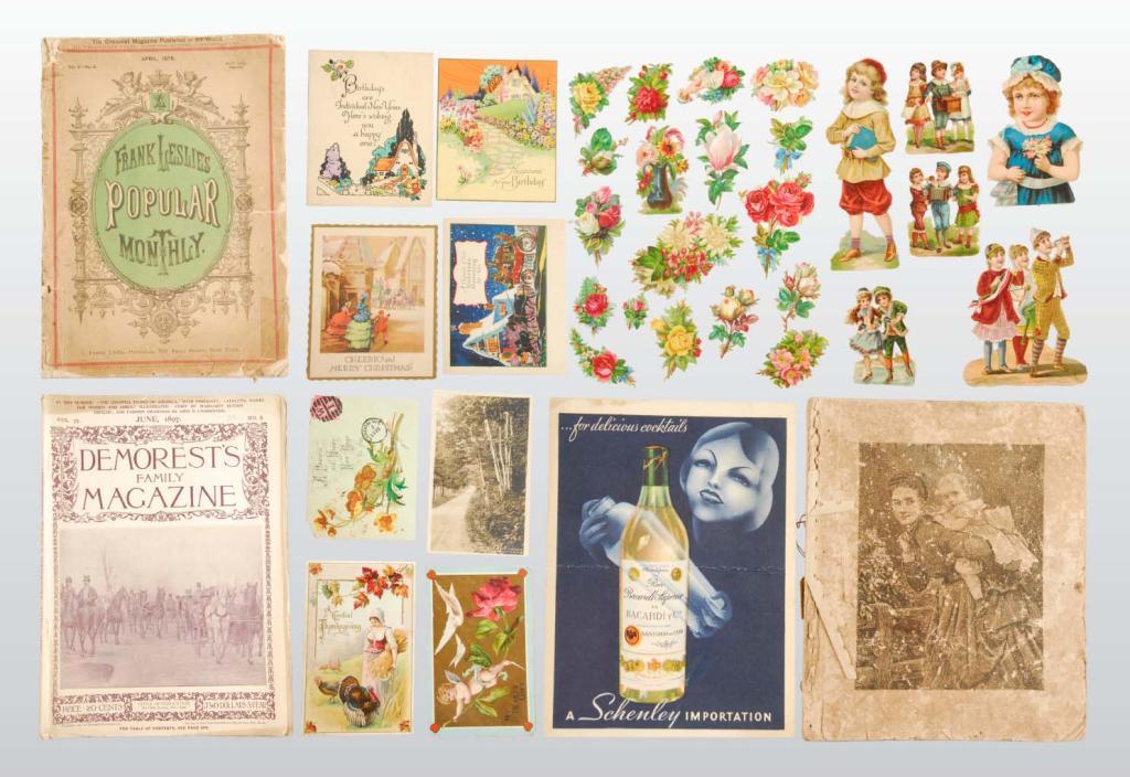 Description ND. An 89 page album crammed with post cards, trade cards, die-cuts, newspaper fashion, one handmade paper doll, prints, scraps, greeting cards and book plates dating from the late 19th century well into the 20th. Condition varies from poor to excellent.