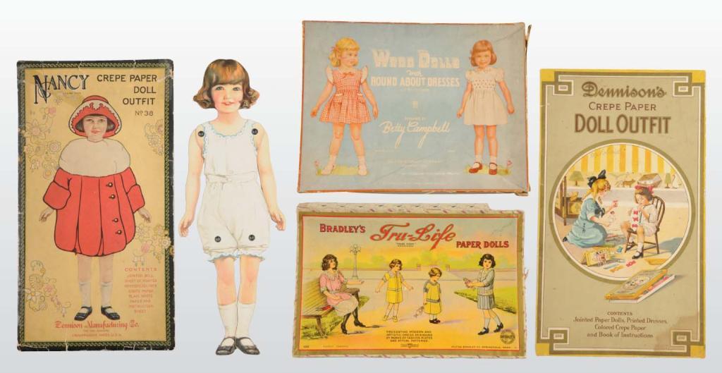 Description ND. This group includes cut and incomplete sets, and bits and pieces. A 'rummage-through' box with dolls/outfits for completing sets and/or providing material for scrapbooks, altered art and other paper projects. Good condition.