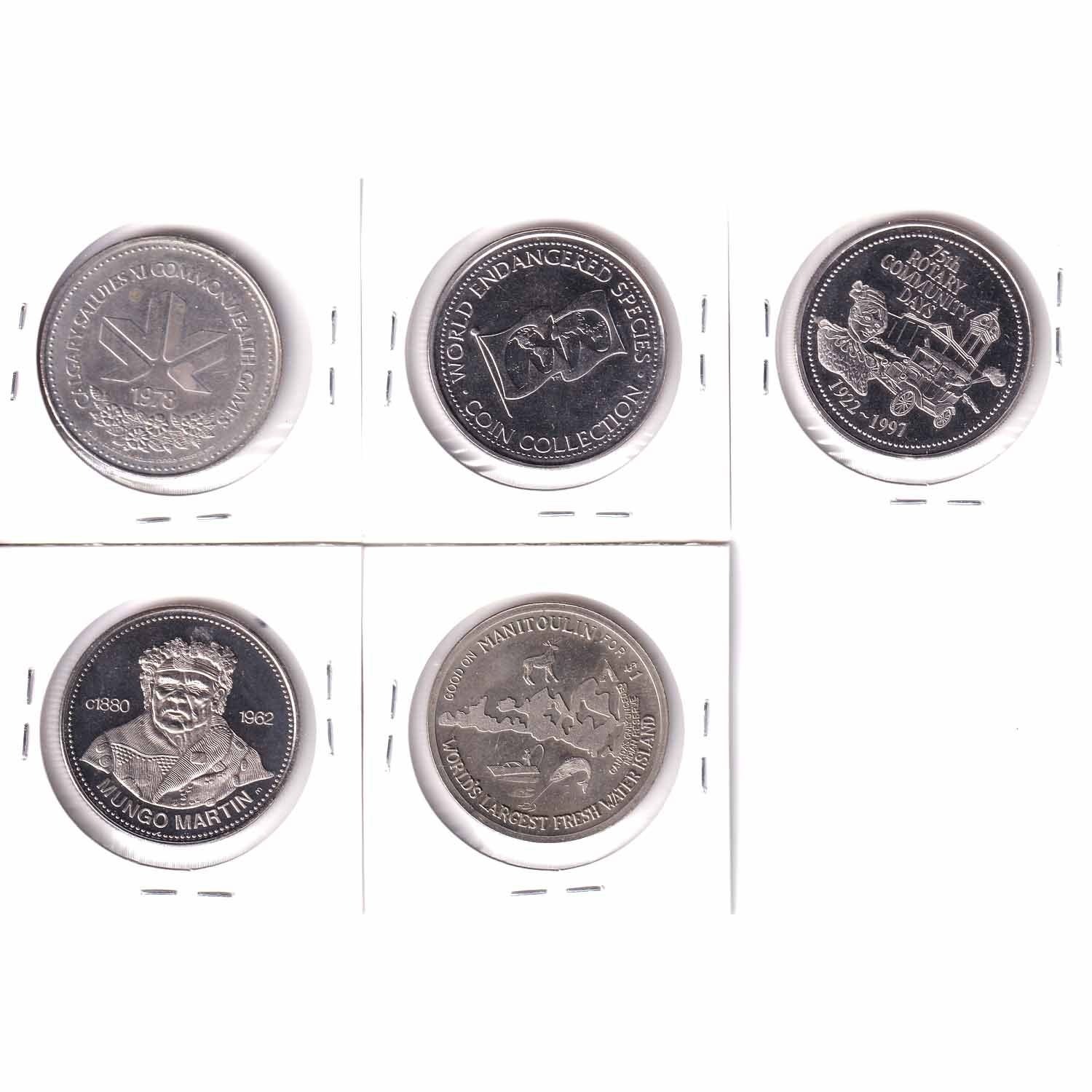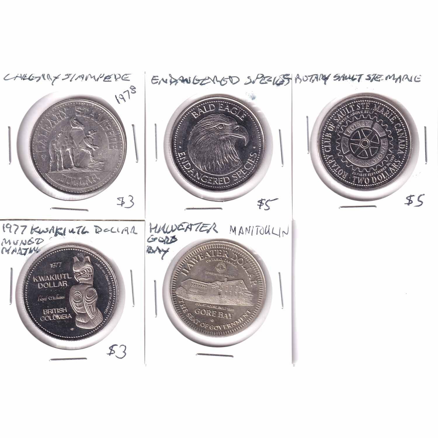 Lot of Miscellaneous Tokens - 1978 Calgary Stampede, Bald Eagle Endangered Species, Rotary Club of Sault Ste. Marie, 1977 Kwakiutl Dollar British Columbia & Gore Bay Manitoulin Haweater Dollar. 5pcs