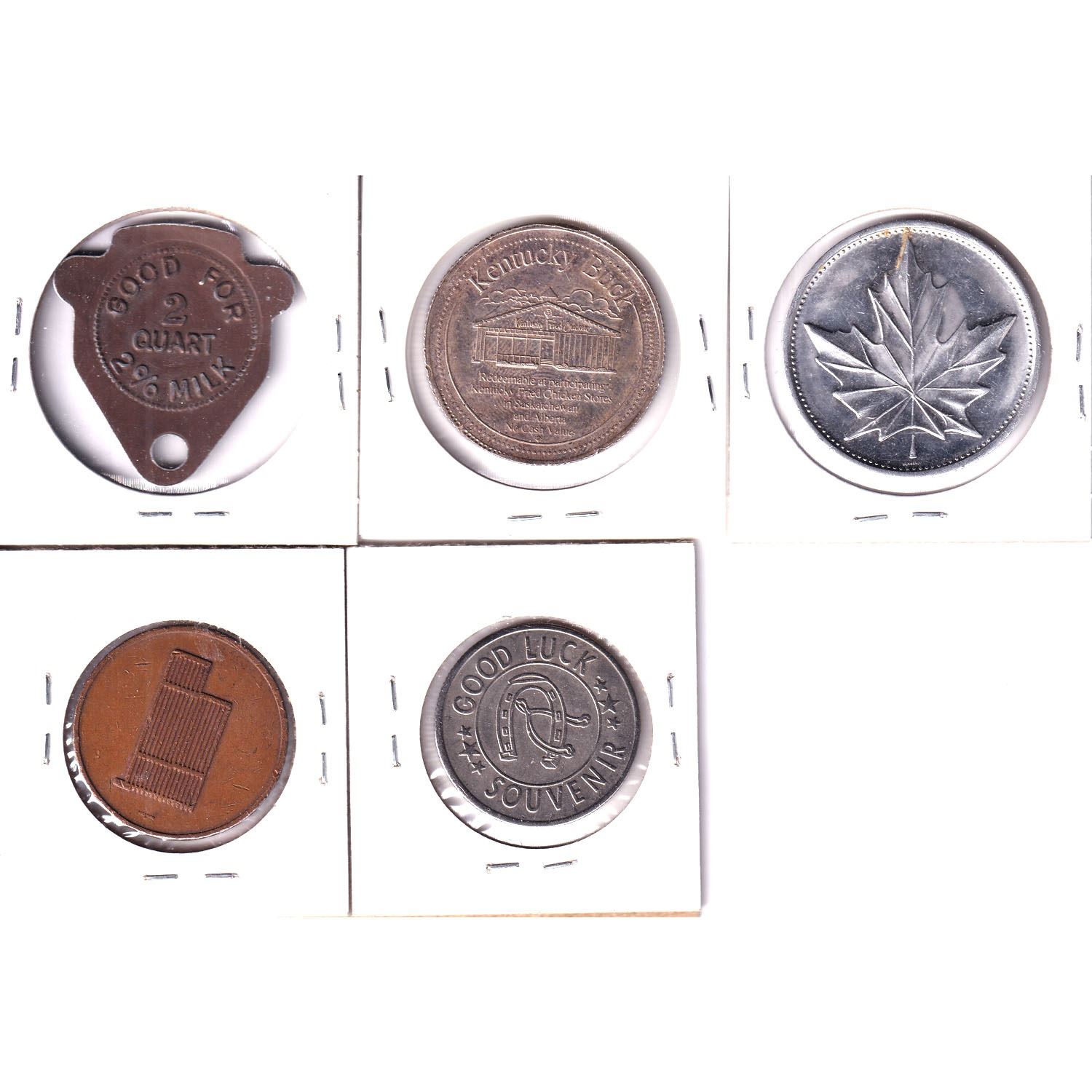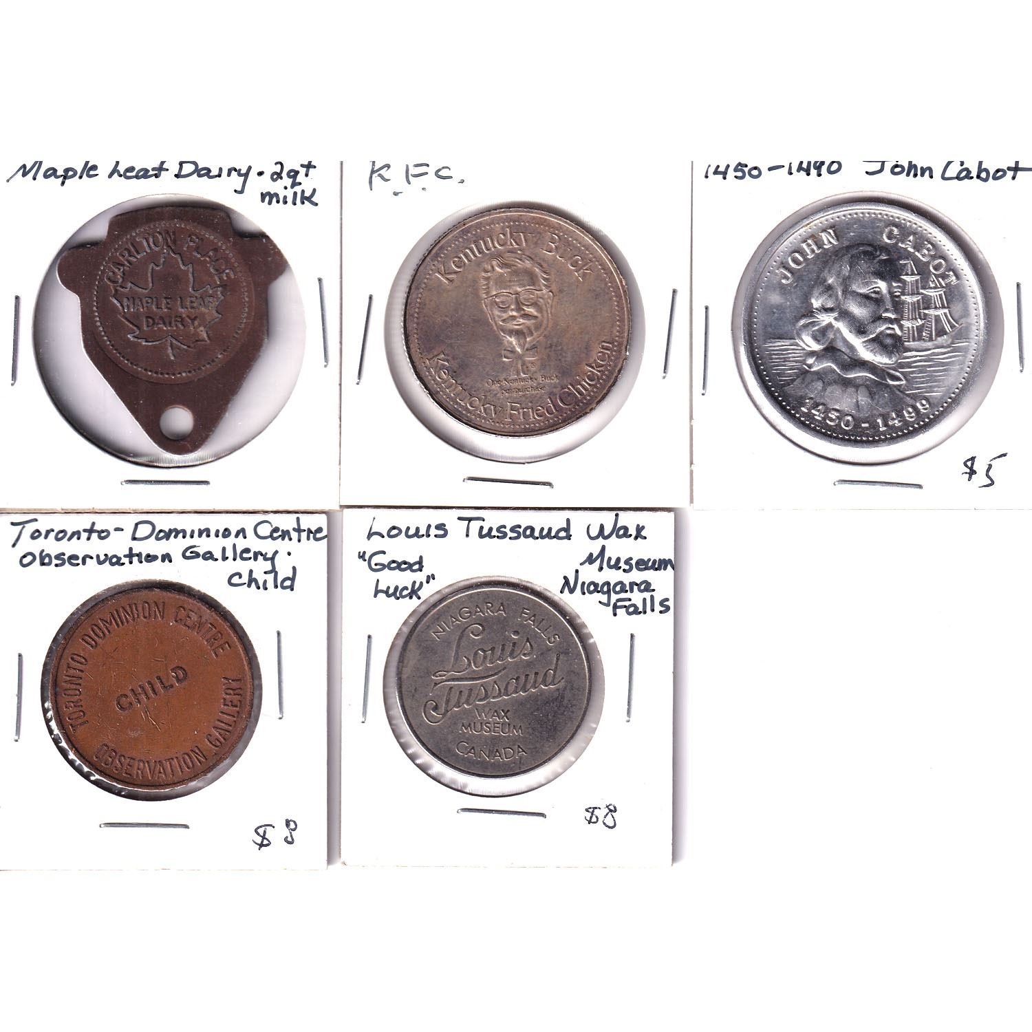 Lot of Miscellaneous Tokens - Carlton Place Maple Leaf Dairy Good For 2 Quart 2% Milk, Kentucky Fried Chicken Kentucky Buck, 1450-1499 John Cabot, Toronto-Dominion Centre Observation Gallery 'Child' & Louis Tussaud Wax Museum Niagara Falls Good Luck Souvenir. 5pcs