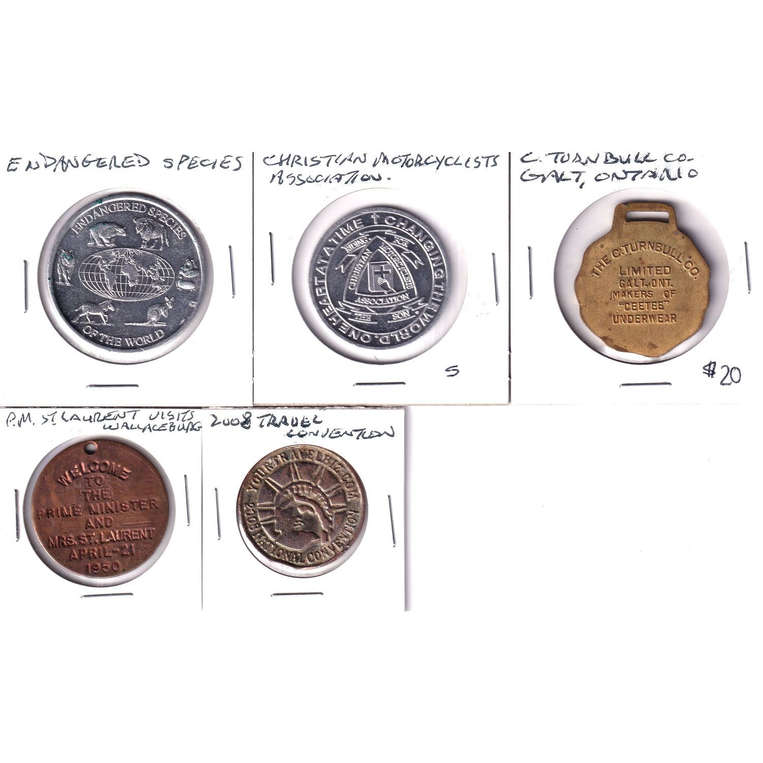 Lot of Miscellaneous Tokens - The C. Turnbull Co. Limited Galt, Ontario Makers of "Ceetee" Underwear, Prime Minister and Mrs. St. Laurent Visits Wallaceburg, 2008 Travel Convention Liberty & Travel For All, Endangered Species of the World Gray Wolf & Christian Motorcyclists Association 'Changing the World One Heart at a Time'. 5pcs