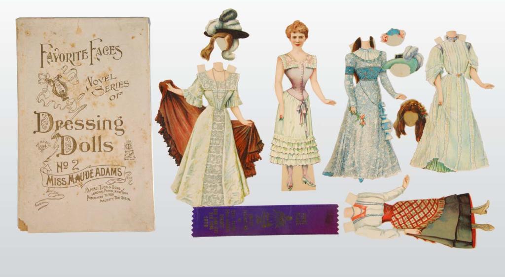 Description Circa 1890s. From Tuck's "Favorite Faces Series", the 9.5-inch doll is complete with four costumes and a box lid. The costumes reflect plays from the Shakespearean to the Victorian eras in which Miss Adams starred. Beautiful, elaborate costumes in excellent condition with minor damage to one headpiece.
