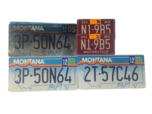 Four pairs of prop license plates. One pair of motorcycle plates is from Missouri and three pairs are from Montana. One is distressed for production.