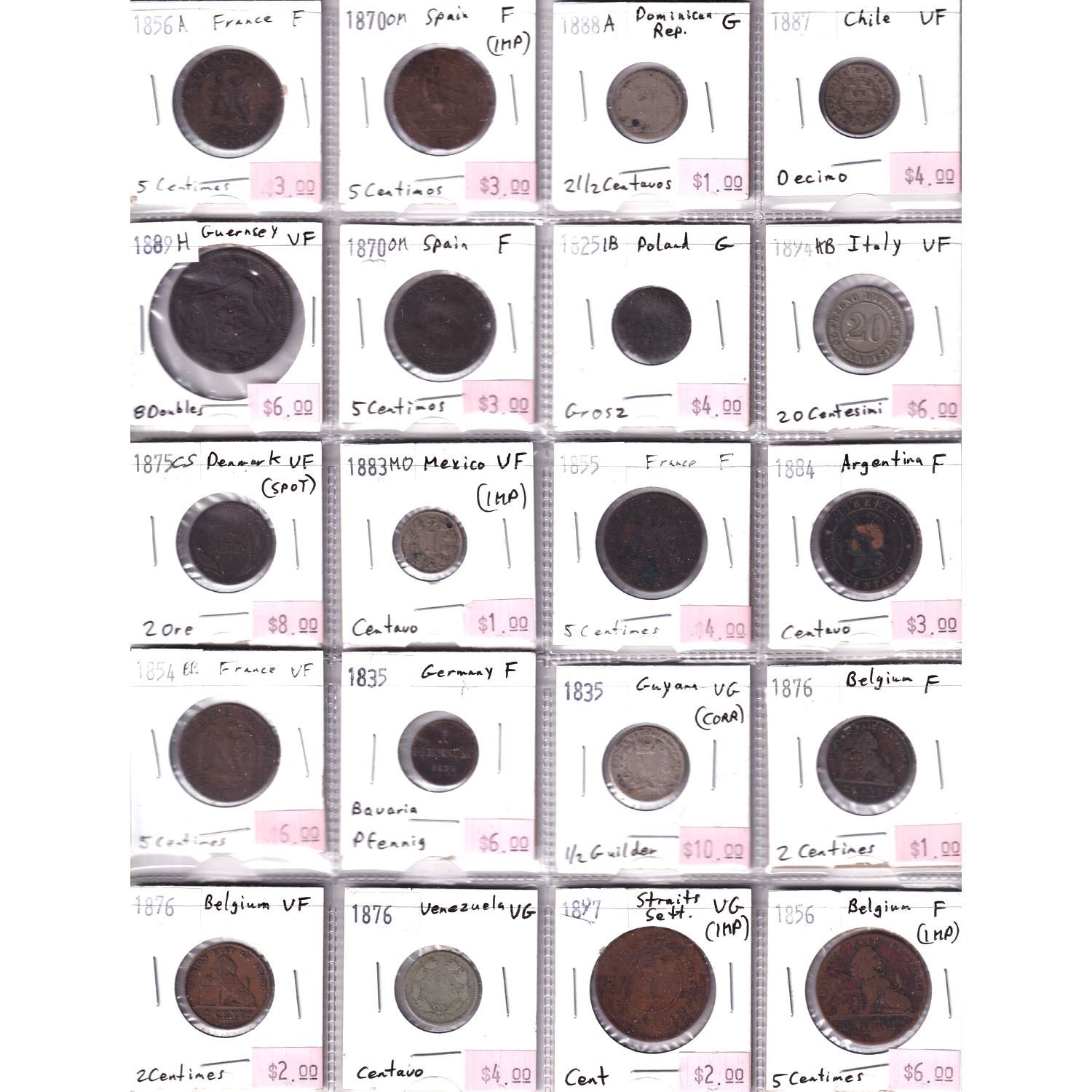 Lot of Mixed 1800's World Coinage in Plastic Page with a Good Mix of 15 Different Countries - France, Spain, Dominican Republic, Chile, Guernsey, Poland, Italy, Denmark, Mexico, Argentina, Germany, Guyana, Belgium, Venezuela & Straits Settlements. 20pcs