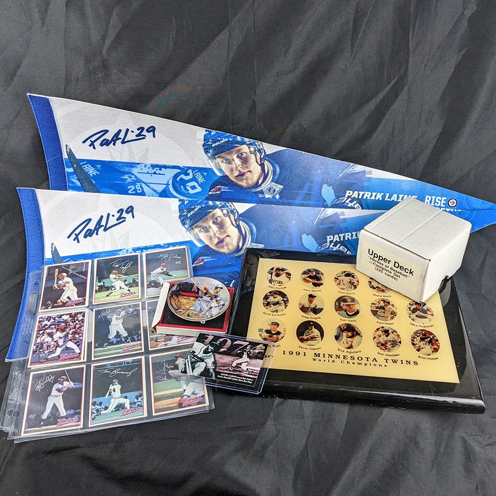 Base Ball Cards, Base Ball Trinket Dish, 1991 Minnesota Twins World Campions Baseball Plaque, & 2 Patrik Laine Jets Flags