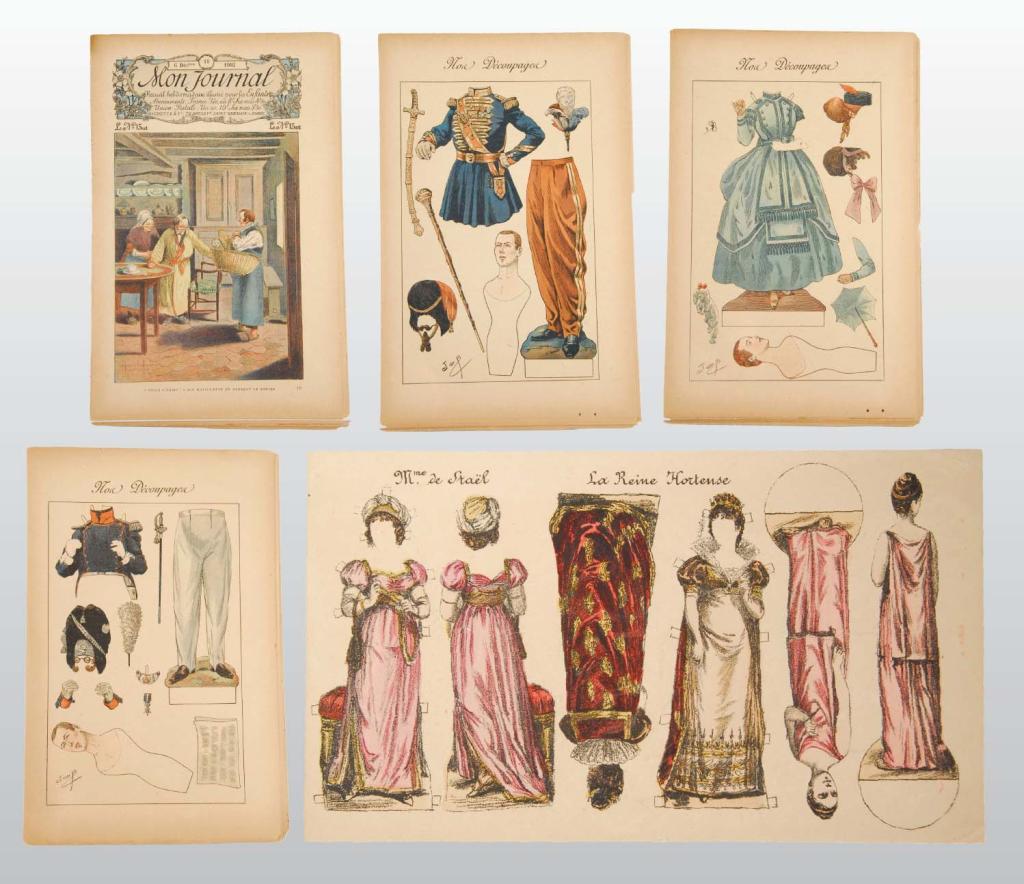 Description Circa 1890s. Three issues have centerfolds illustrated by JOB. There are two back/ front paper dolls of officers and one of a lady. There are no paper dolls in the fourth magazine. An uncut sheet of back/ front women with gowns for La Reine Hortense and Mme. De Stael is also included. The lot is in excellent condition.