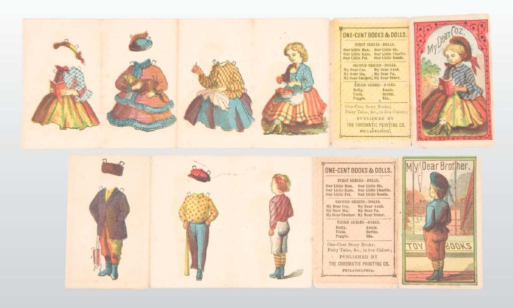 Description Circa 1870s. This lot of two uncut 3" x 9" folders was published by the Chromatic Printing Company in Philadelphia during 1874 through 1877. Although the firm proved to be no match for the McLoughlin Brothers in creating quality paper dolls, the thirty known folders it produced are prized by collectors seeking the rare and unusual. "Coz" and "Brother" each have three outfits and three hats. These brightly colored folders have minor wear and are in fine condition.
