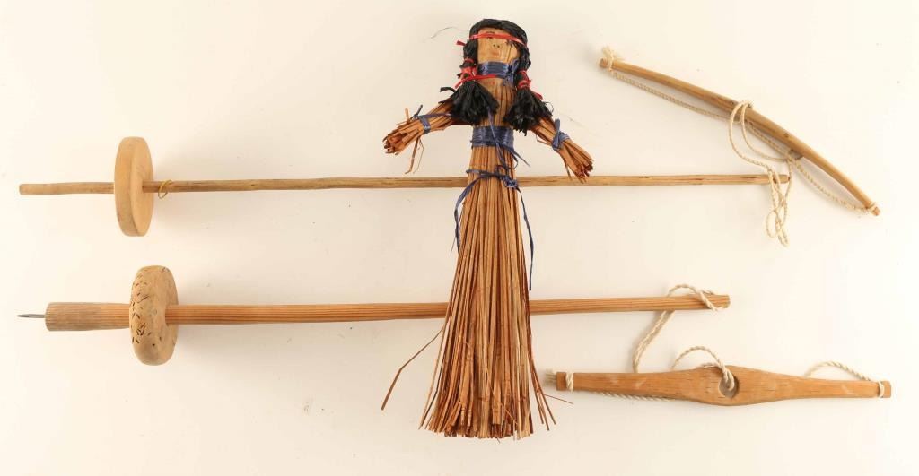 Including; (3) Maidu/Washo cradles measure 11"x26" good condition, 12"x37 1/4" sun shade has come away on one side, 14 1/2"x36" sun shade has come away on both sides. (2) Wooden Bow Drills 25"l and 28 3/4"l and a cedar doll measures 15"h. All are circa 1940