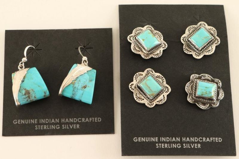 Including: Turquoise hammered silver tuxedo button set with a single square cab set in a sterling scalloped floral motif, and a pair of turquoise silver leaf French hook earrings.