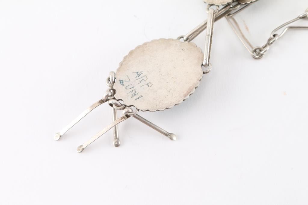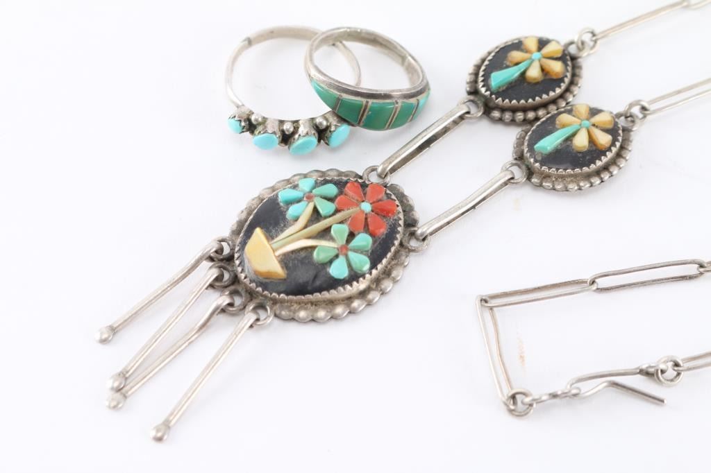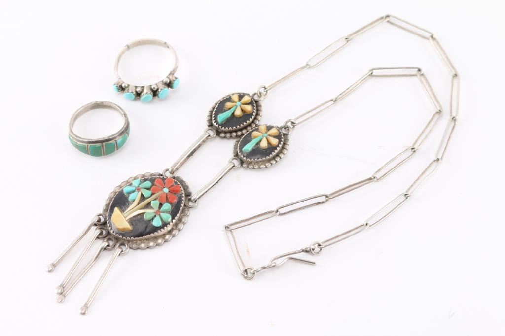 (1) Zuni sterling silver necklace with pendant of turquoise, mother of pearl and coral flower design on onyx on, signed ARP Zuni, on back. Measures 11" from drop.(2) Old sterling and turquoise rings, one with inlaid green turquoise, size 7, and one with 5 set blue stones, size 10.
