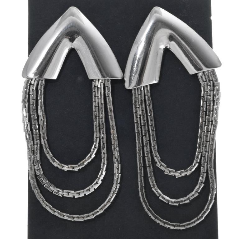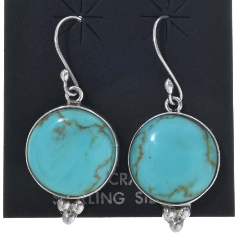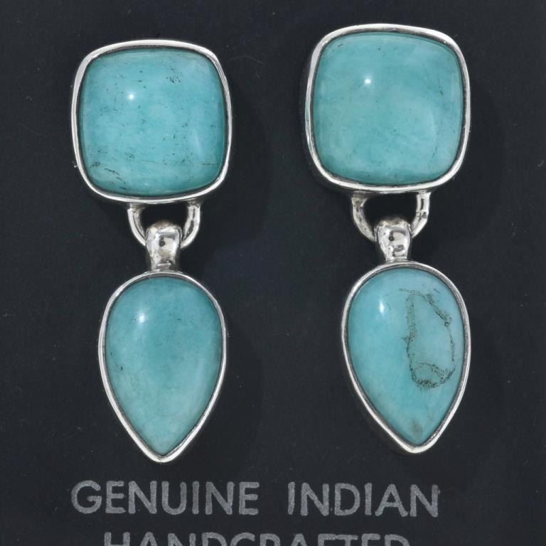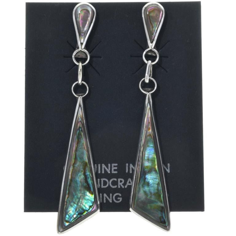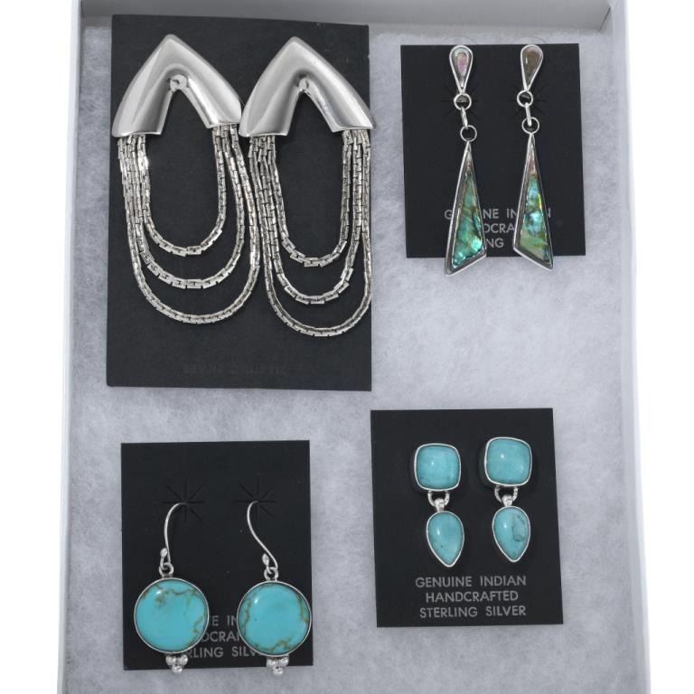 Earrings. Lot includes 3 pairs of Navajo Sterling, french hook and post dangle earrings. Stones include genuine Turquoise and Abalone shell. One pair of contemporary Sterling fashion earrings. Longest is 2-3/4”, shortest is 1-1/8” long. Some hallmarked.