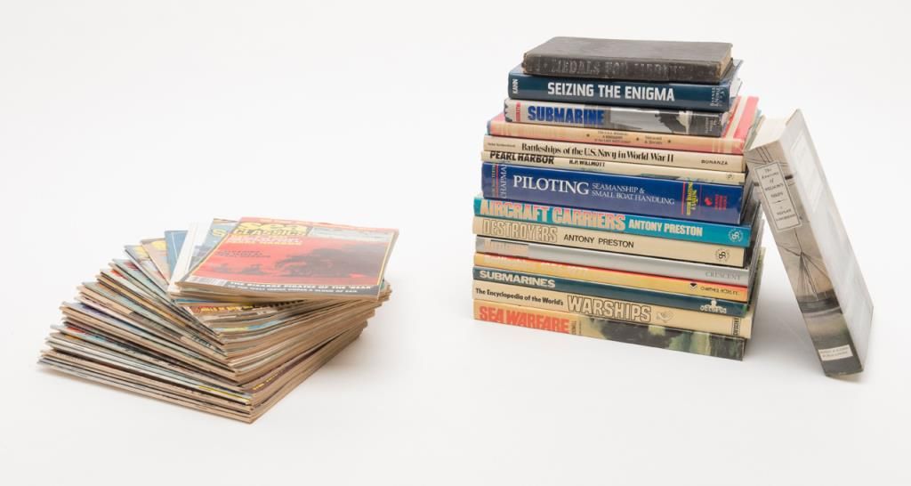 Lot of Naval books, mostly hardbacks and several dozen “Sea Classics” magazines; books including “Destroyers” by Preston; “Aircraft Carriers” by Preston; “Sea Warfare” by Crowell; “Seizing the Enigma: The Race to Break the German U-Boat Codes” by Kahn and approx. 11 more; great references for the home library. Est.: $100-$300.