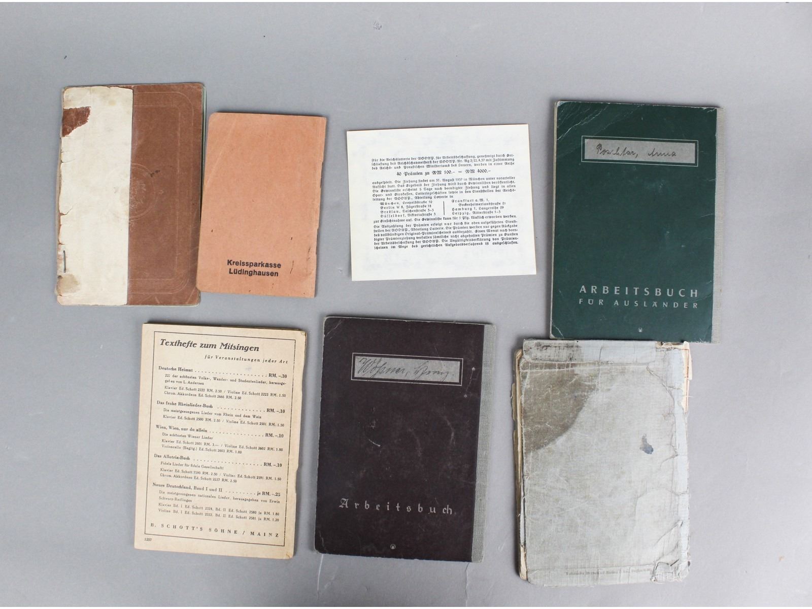 Lot of Nazi ID Books and Paper Goods includes 4 ID books, Labor Corps ID card, photo postcard with 2 patches, ration book, lottery ticket and a soldier song book.