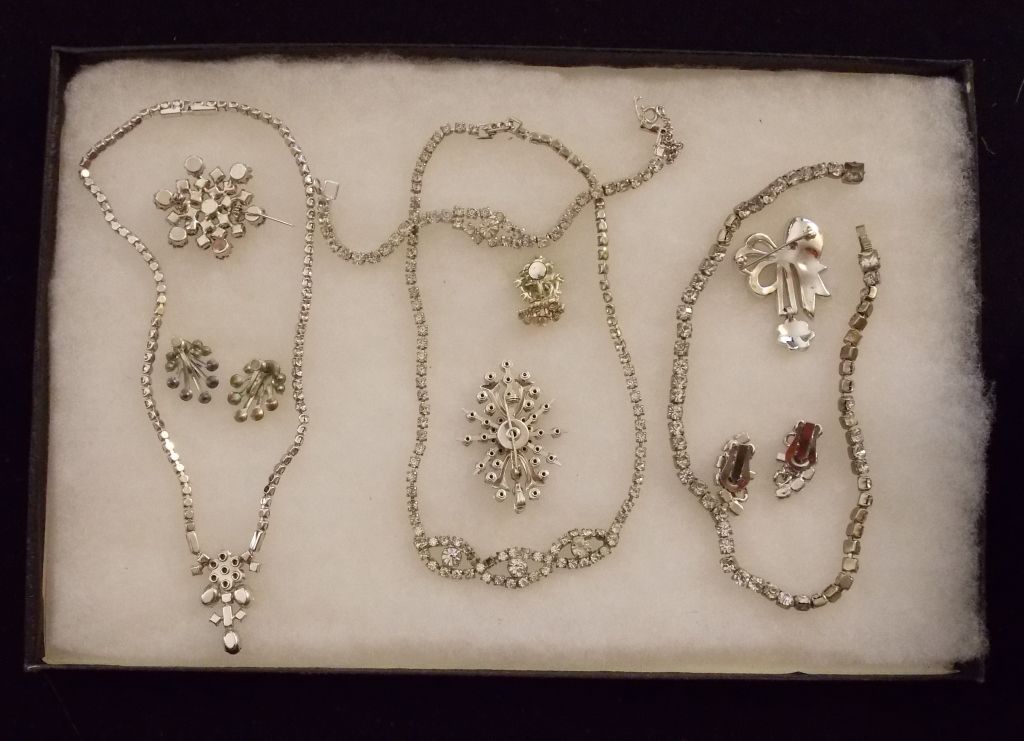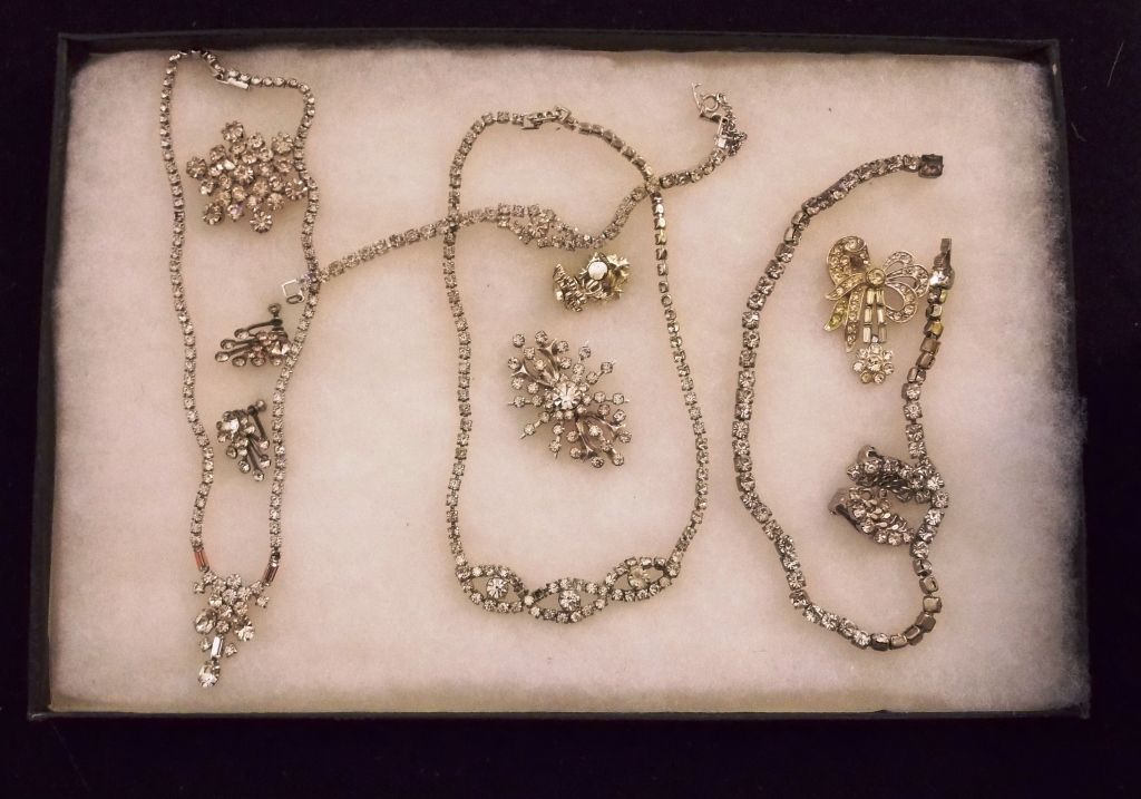 Tray Lot of Vintage Necklaces, Ear Rings, Bracelets, and Brooches with Clear Rhinestones from the '60s. Comes as shown in Photos. Case for display only and is not included.