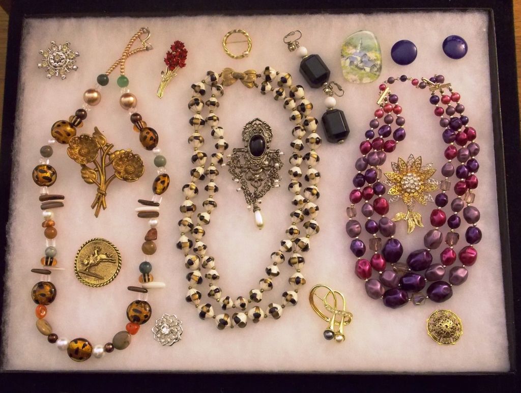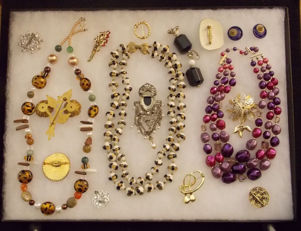 Vintage Costume Jewelry Lot of Necklaces, Ear Rings, and Brooches with Citrine, Black, White and Crystal Beads and Imitation Pearl from the '60s -'70s. Comes as shown in Photos. Case for display only and is not