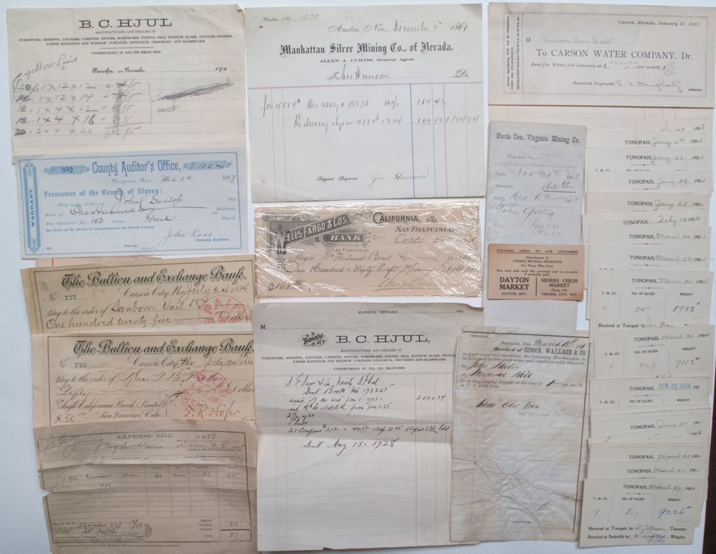 Includes business card for the Dayton Market, 1904 teamster receipts for sacks of ore in Tonopah, Sisson and Wallace of Palisade billhead, John Gillig VC billhead, 1887 Storey County Auditor's warrant, B. C. Hull billhead from Eureka, Carson Water Company 1901, and four Bullion and Exchange Bank checks 1884.