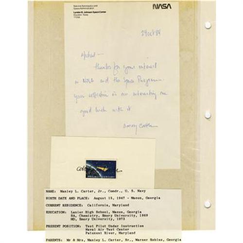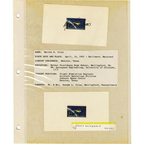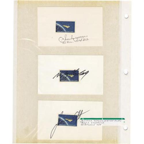<B>Lot of Nine Astronaut, Aviator, and Engineer Signatures,</B></I> including: Chuck Yeager, W. L. Shepard, Jerome Apt, Story Musgrave, Marsha Ivins, Manley Carter, and Frank Culbertson. Each signature is on or near a space related stamp mounted on a 5" x 3" card. One astronaut, Frank Culbertson, also signed an official NASA photograph. Manley Carter also signed a note. All cards, note, and photo are in acetate album pages. All are very fine.<BR><BR><b>Shipping:</b> Flat Material, Small (<a target="_blank" href="http://www.heritageauctions.com/common/shipping.php">view shipping information</a>)