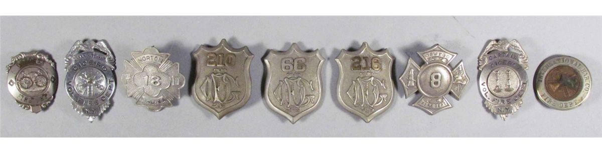 Lot of Nine Fireman's Shields, including 210, 66, 216, Norton, VA, Oneonta, Cicero, Oswego, and International Har. All in very good condition.