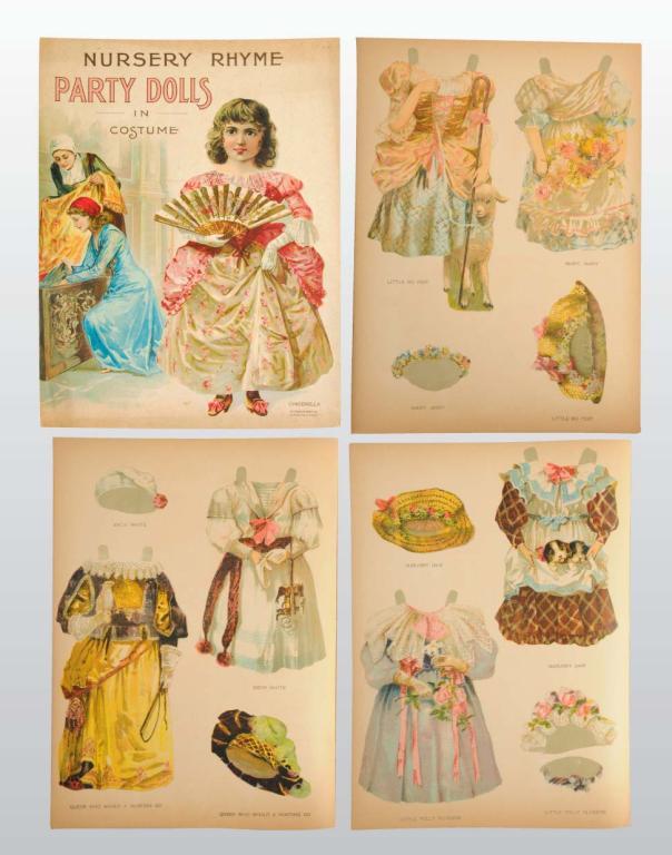 Description ND. This 9.75" x 13.75" McLoughlin book has two dolls and six clothing pages. Costumes include Queen of Hearts, Red Riding Hood, Columbine, Snow White, etc. The book is in fine condition with minor wear and one doll separating from the cover.