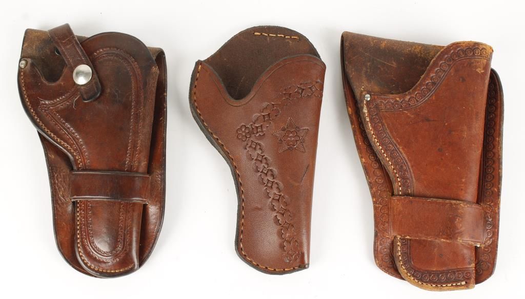 Includes (1)for short barrel Colt and a vintage G Casteel, (1)for short 3"-4", and (1)hand tooled 3" leather holster with strap