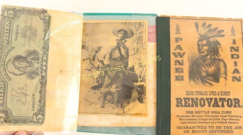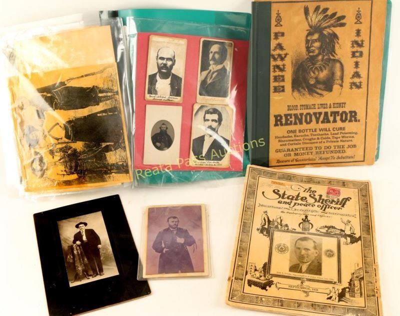 Including; Tokens from the Red Dog Saloon in Virginia City, vintage photos and a tintype, ad for Pawnee Indian Renovator-"One Bottle Will Cure", and an issue of "The State Sheriff and peace officer" dated September 1931 out of Oklahoma.