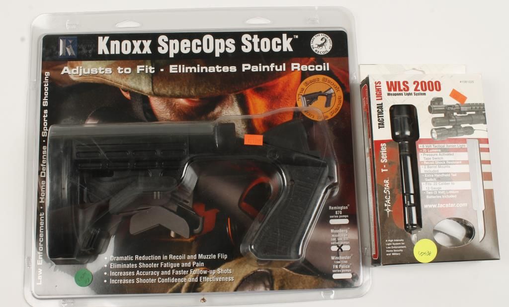 Polymer Knoxx Spec-Ops 5 position collapsible stock and pistol grip to fit a Mossberg shotgun. TacStar flashlight with pressure switch and barrel mounts.