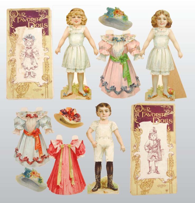Description ND. There are two 16-inch dolls with clothing and folders. The sets are not complete and show wear and age. The folders have wear, chips and soil. Very good condition.