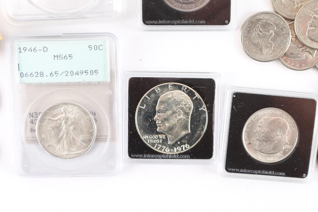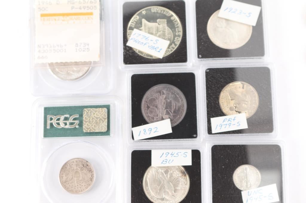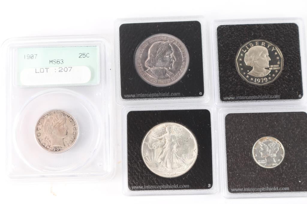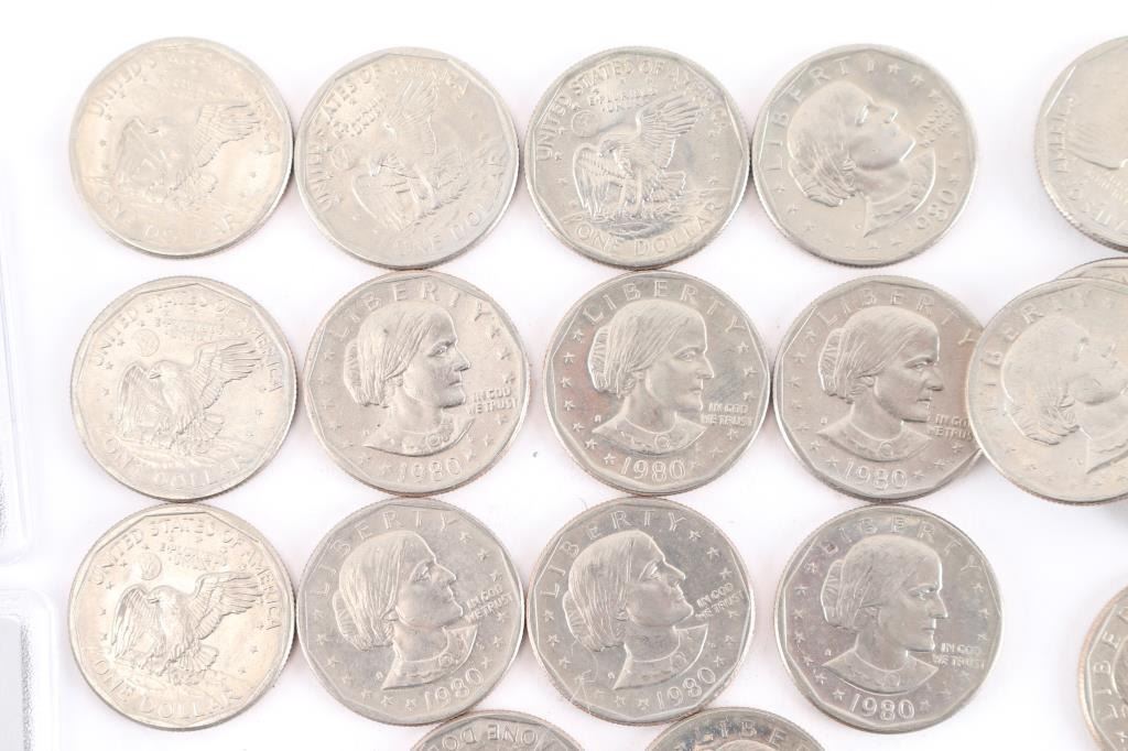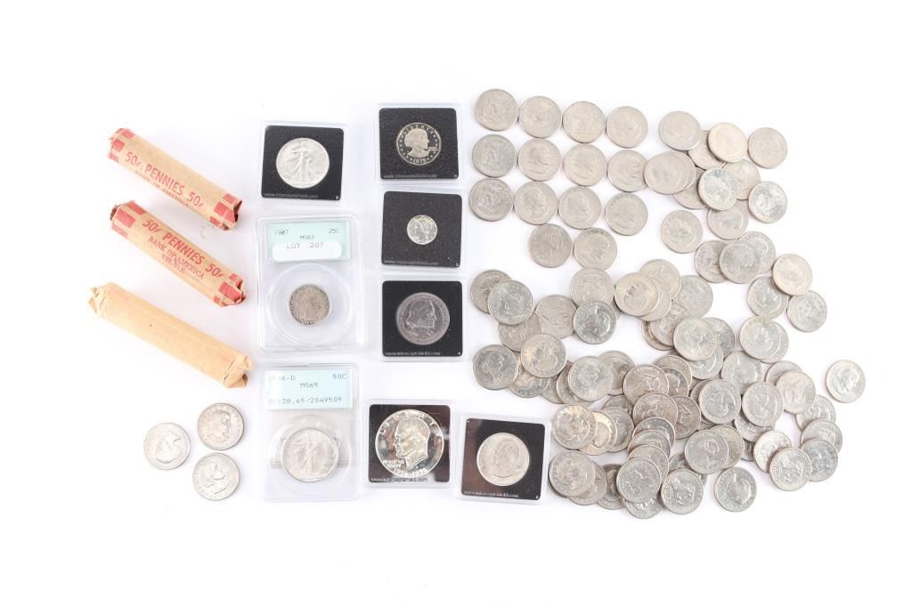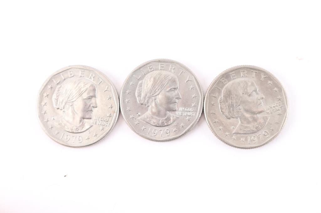 Includes: (1)1907 Barber quarter MS63. (1)1946 Liberty Walking half dollar MS65 and many others. Also approx. 109 Susan B Anthony coins total. (3) 1979 dollar souvenir set in OGP. (3) 1979 in baggie. (100) 1980 in US Mint canvas bag. (3) 1980 dollar souvenir set in OGP. (3) Rolls of pennys.
