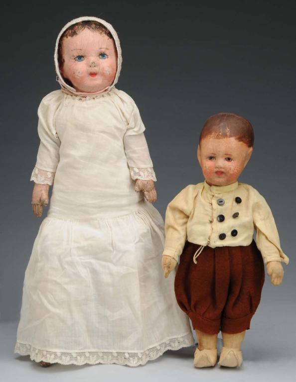 Description Largest doll is an "Alabama Baby" with molded and painted features including painted yellow boots. The smaller is a swivel-neck Bing-type doll with cloth body and molded, painted head wearing original clothing and felt shoes with turned-up toes. Both dolls have wear to the face but no obvious repair or repainting. Condition (Fair - Good). Size Largest: 18 - 1/2" T.