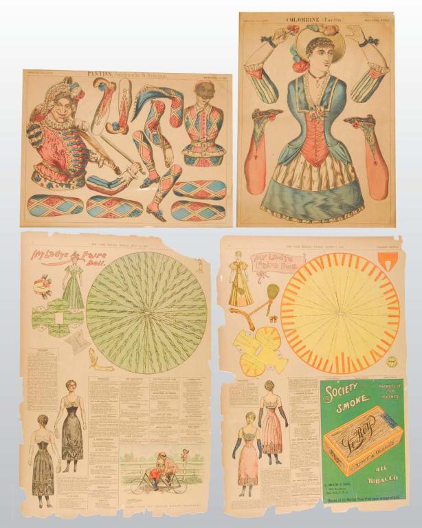 Description 1897. Two 14.75” x 22” New York Herald sheets. Includes “My Lady Faire Doll”. A stand-up doll can be made from each sheet by pasting a front/back doll together, attaching her bodice and sliding her into a huge circular skirt. One sheet advertises the “Society Smoke”, Le Roy Cigarettes and the other has a drawing of a couple on a bicycle built for two while cupid rests on a fence. Fragile sheets with small tears and small pieces broken off. Lot also includes late 19th century, two framed/matted Epinal sheets of Punch/Judy characters. Columbine is on one and Polichinelle and Arelequin on the other.