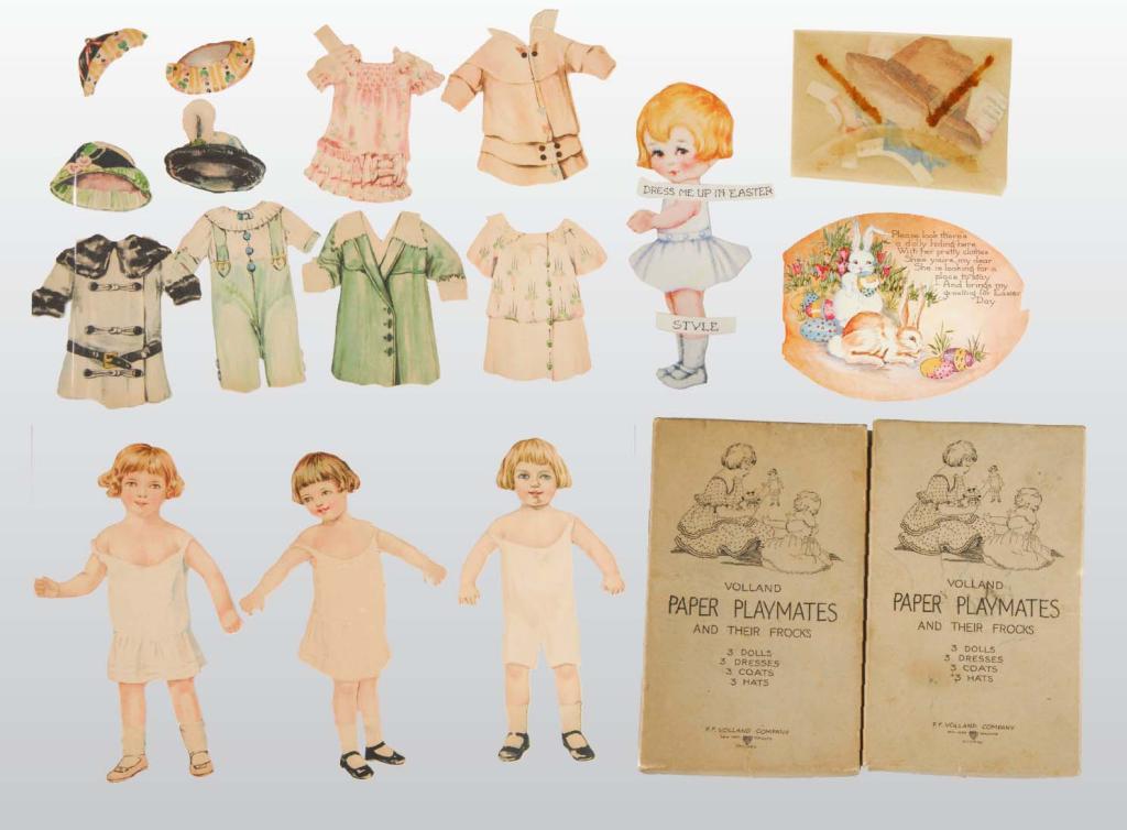 Description ND. Two incomplete boxed sets, published by the Volland Company, have three dolls and clothing in each. There are four Easter greeting cards, in the shape of eggs, that open to either a child or a chick. All show average age and wear.
