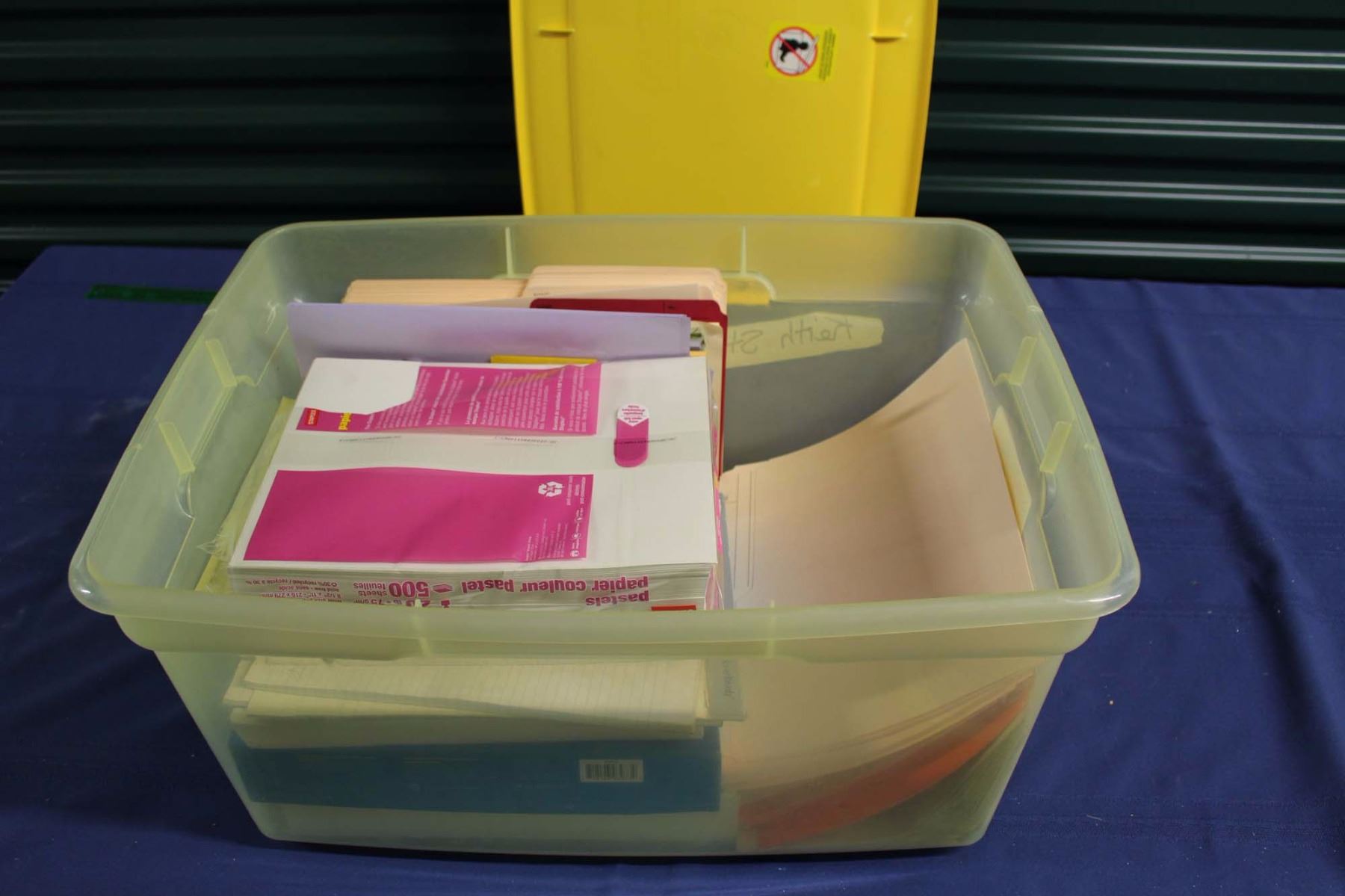 Lot of Paper, Note Pads, Folders, Etc With Plastic Tub