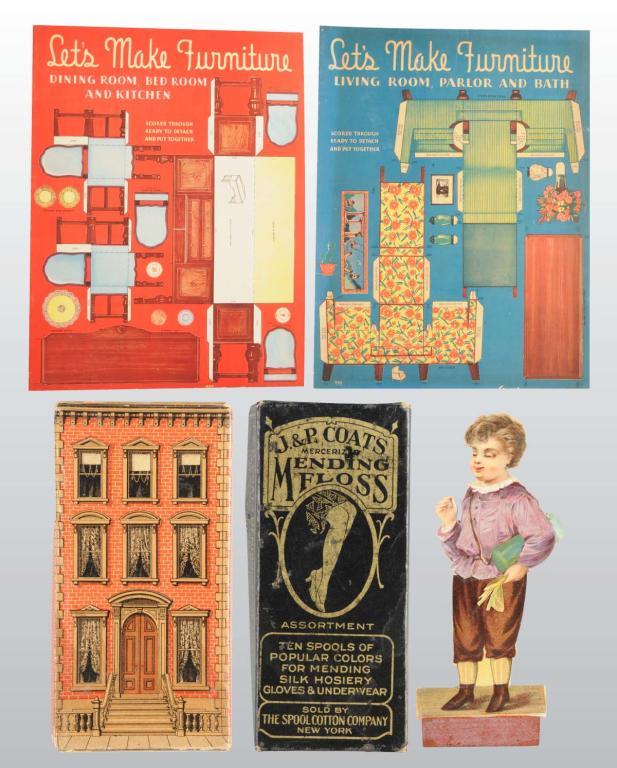 Description ND. Spanning several decades, this lot includes "Susie and Willie", and "Rosey and Charlie" housed in two boxes designed to look like brick townhouses. Also included, the 1934 "Let's Make Furniture", uncut, and one small doll housed in a J. P. Coats box. The lot shows wear and age.