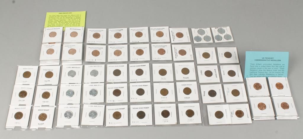 Including: 20 Wheat Pennies from various dates ranging from 1919 to 1957. 6 Indian Head Pennies from various dates ranging from 1882 to 1904. 12 Steel War Pennies. 8 2009 Lincoln Cent Pennies from Denver and Philadelphia. 8 uncirculated Old Lincoln Cent's from various dates ranging from 1959-1988. 2 uncirculated Old Wheat Cent's from 1955 nd 1957D. 8 US Treasury Commemorative Medallions from Denver and Philadelphia.