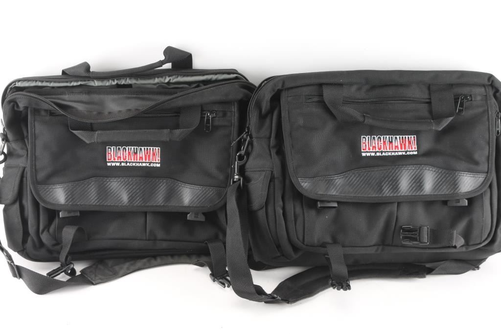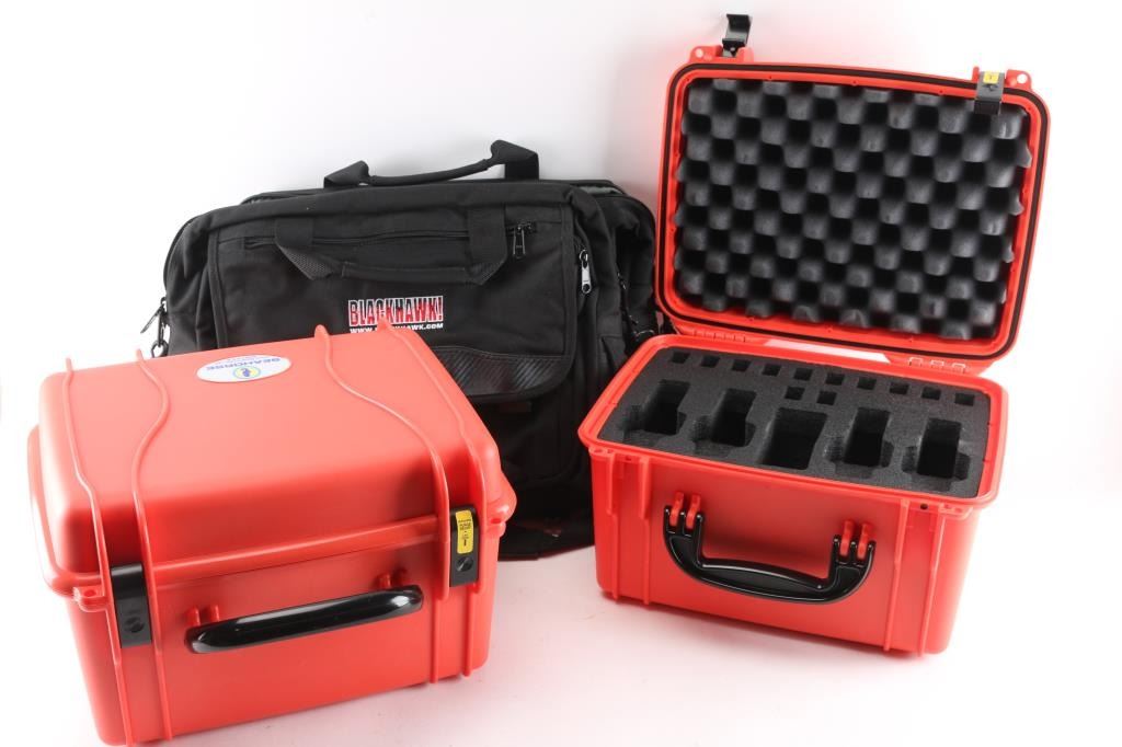 Four total. 2 - Orange colored Seahorse SE540 hard shell protective cases. One case fits 4 pistols, 12 pistol magazines and small center pocket for eye & ear pro, weapon lights, etc...Seahorse cases have been waterproof tested & proven to withstand all IP67 standards. Built for continuous submersion of up to 3 meters deep. Also included are 2 - Black colored Blackhawk laptop computer/ brief cases made of cordura/nylon/neoprene w/multiple pockets inside and out, for laptop computer, pistol, etc...All unused and in excellent condition.