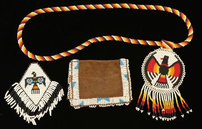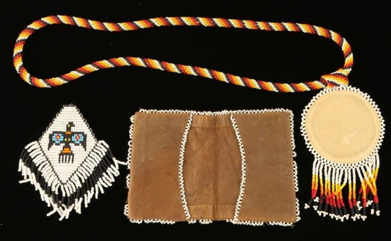 Including;Beaded leather wallet with blue and white beaded border, measures 4 1/2"x3 1/2", beaded fringed pendant with thunderbird design in white, black, blue, yellow, red and orange beads-measures 4 3/4"x4 1/2", and a beaded leather pendant with thunderbird design with beaded necklace in white, black, orange, red, and yellow beads-measures 3 1/4" x 19". 20th Century designs.