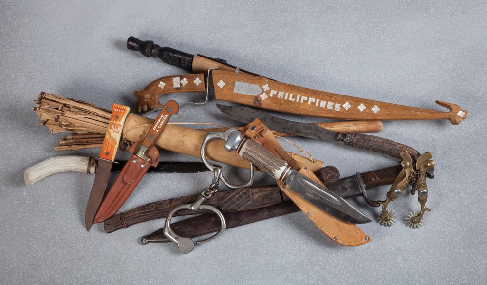 Lot of Pocket Watches, Knives and Misc Items from the Roy Rogers Museum. a) Group of 4 antique pocket watches, consisting of a Hamilton, a vintage Gruen Veri-Thin, a Bristol and a Geneva;. b) A Carl Schlieper Hunting Knife marked Carl Schlieper Solingen Germany;. c) Marked Tower Bean Handcuffs;. d) Pair of Hercules bronze spurs;. d) 8 various knives, 2 military scabbards, and wooden arrows from the Museum. Provenance: Roy Rogers and Dale Evans Museum, Victorville, CA and Branson, MO;. to Christie's, July 2010 and Burley Auction, April 2011; to present owner. Includes Certificate of Authenticity signed by Roy "Dusty" Rogers, Jr.